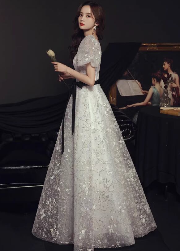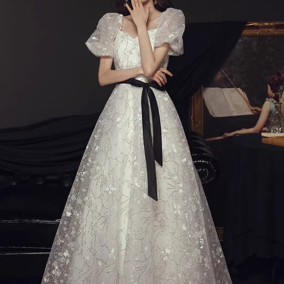 ドレス イブニングドレス パーティー 二次会 披露宴 ステージ フォーマル ロング 半袖 バルーンスリーブ 袖あり スクエアネック プリンセスライン Aライン イブニング リボン ウエストリボン ハイウエスト 透け感 スパンコール 可愛い きれいめ 大人可愛い 上品 おしゃれ エレガント 主役級 存在感 清楚 ゴージャス 華やか 花柄 柄 イベント 二の腕カバー 脚長 高見え 夏 秋 2XL S M L XL 春カラー 白 ホワイト