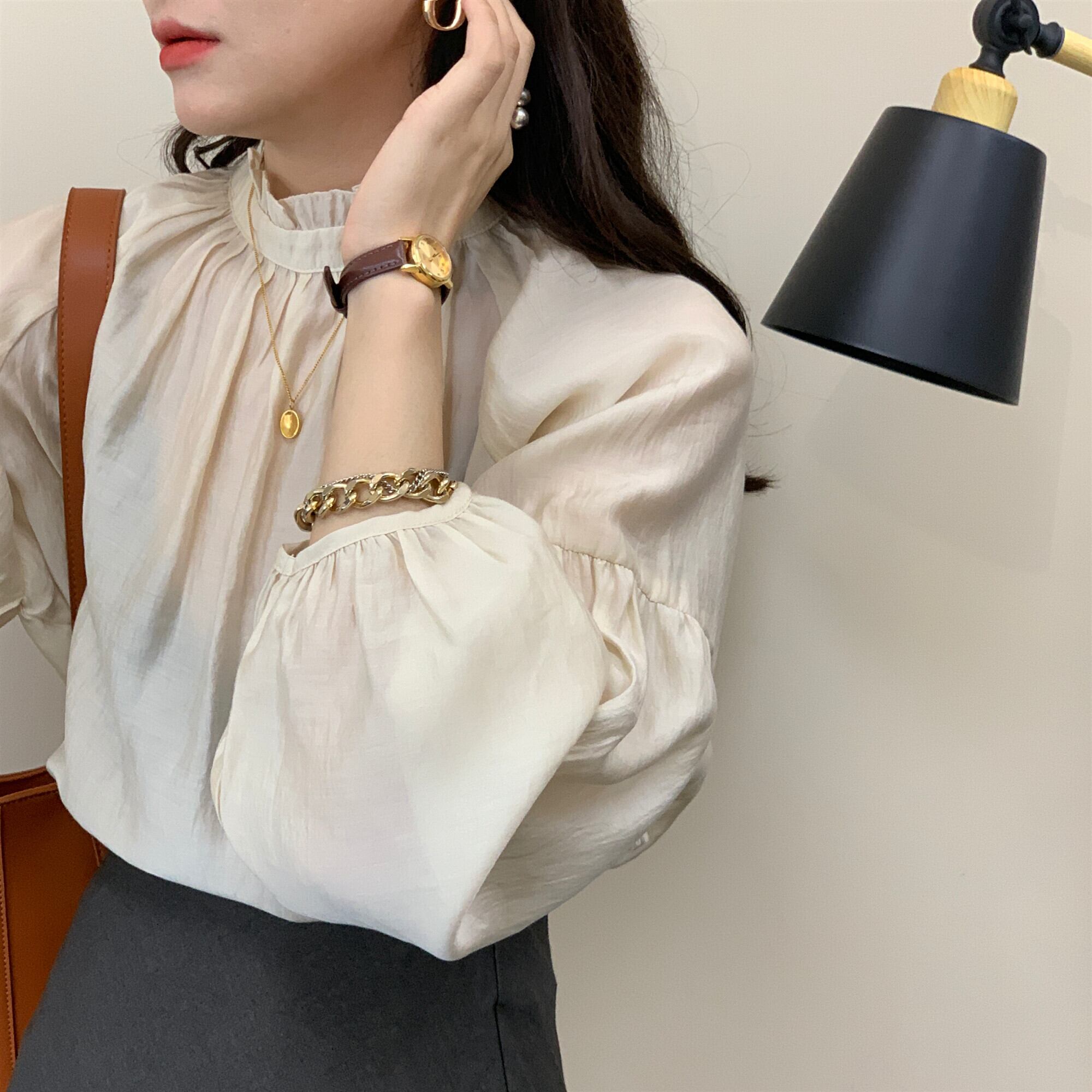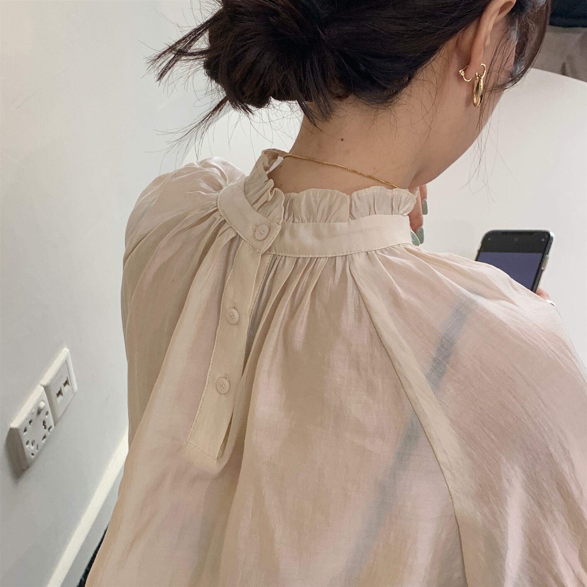 ロマンティック感たっぷりのスタンドカラーギャザーブラウス。