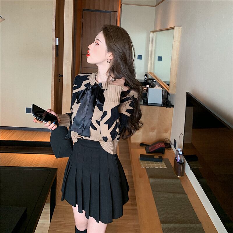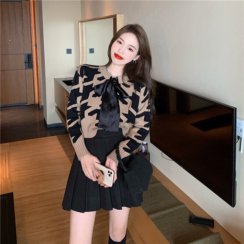 大きめ千鳥格子柄のニットカーディガンと黒無地のミニ丈プリーツスカートのセットアップです。カーディガンはリボンタイ付きのショート丈で、女の子らしい印象を演出。スカートは膝上ミニ丈のハイウエストデザインで、脚長効果抜群です。