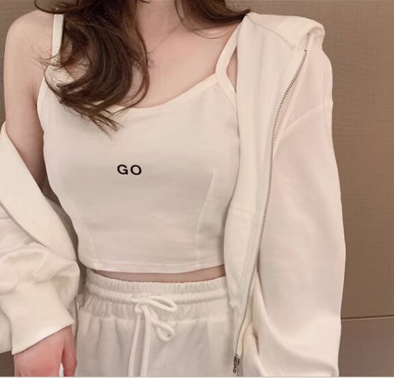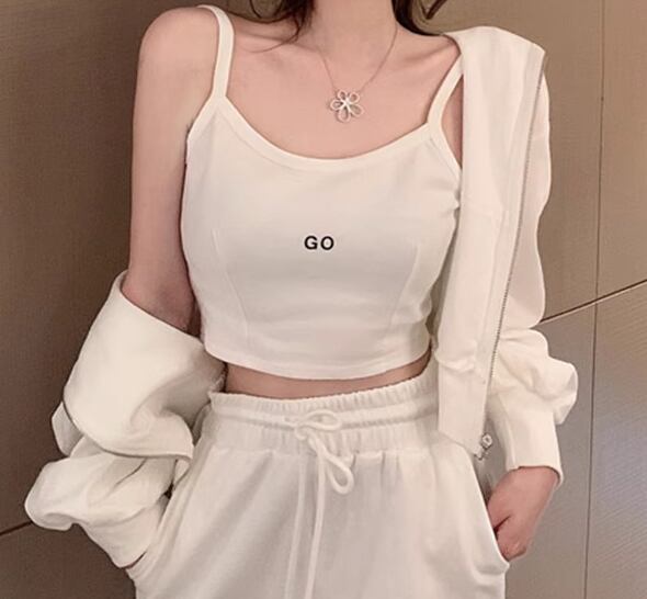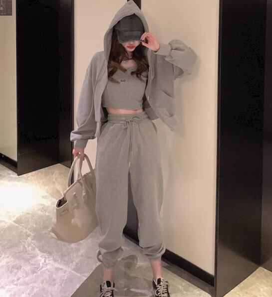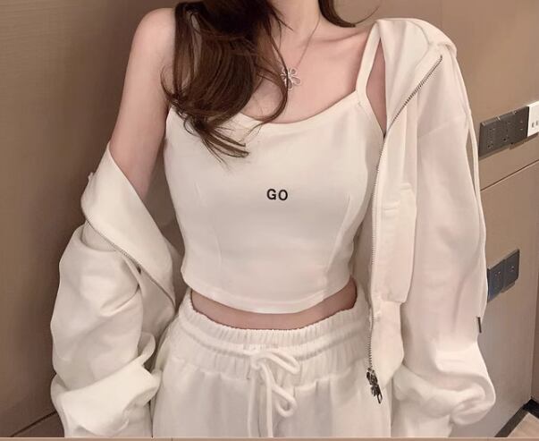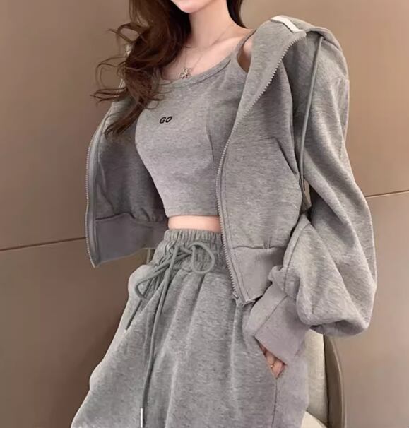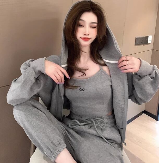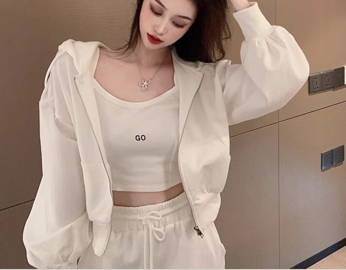 長袖のジップアップパーカーとクロップド丈のキャミソールインナー、フルレングスのパンツの三点セットです。