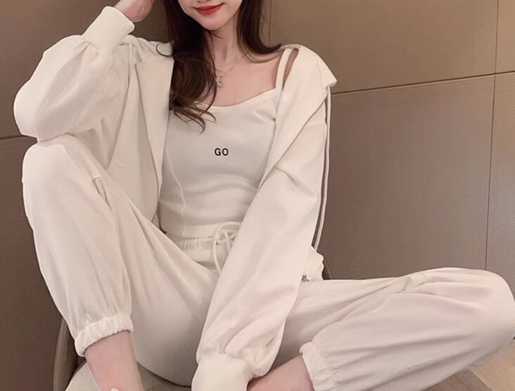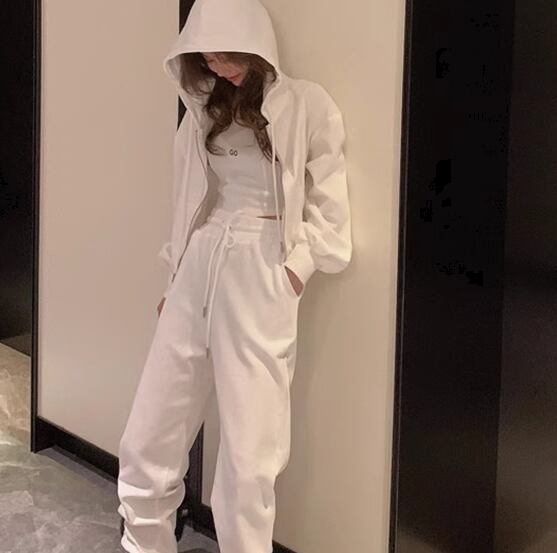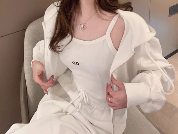 上下セット 三点セット スリーピース レディース パンツ パーカー スウェット ジャージ キャミソール セットアップ スポーツウェア フルレングス 袖なし ノースリーブ 長袖 ストリート ファスナー ハイウエスト 前開き フード 大人可愛い シンプル カジュアル おしゃれ かっこいい ラフ メンズライク ボーイッシュ スポーティー ルーズ クール ハンサム シック スタイリッシュ 無地 春 重ね着 韓国 脚長 普段使い 着回し レイヤード トレンド 流行 M L XL ホワイト ブラック グレー
