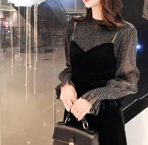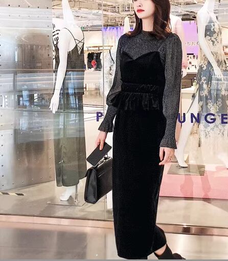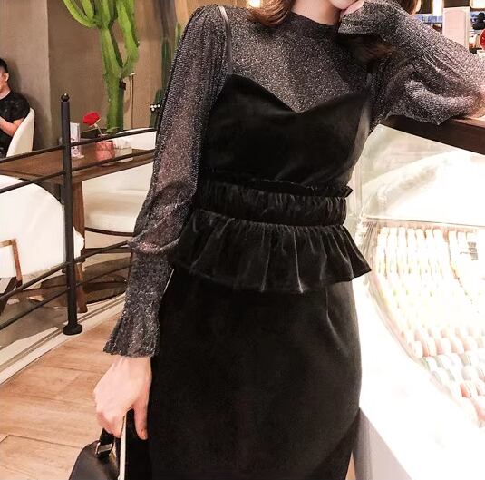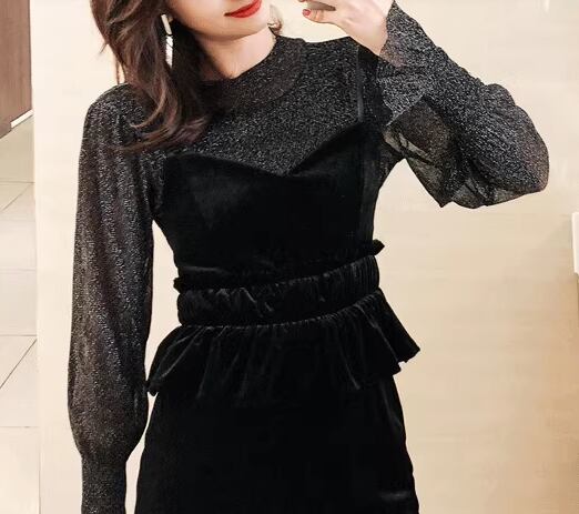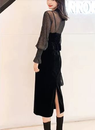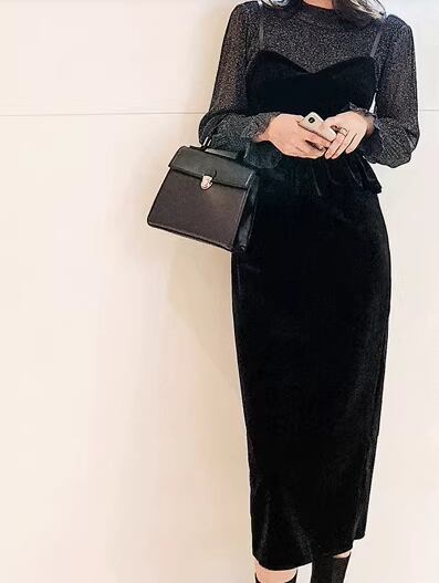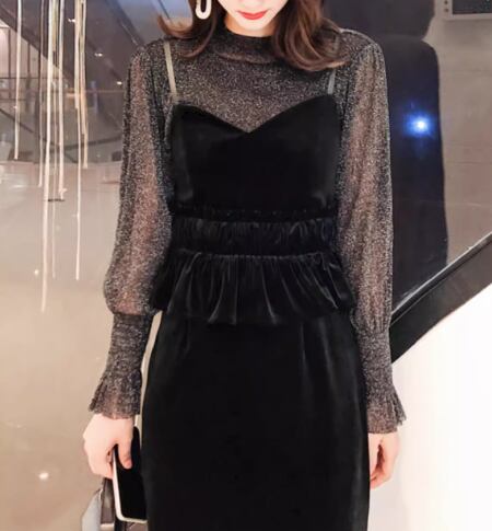 二点セット ツーピース レディース トップス ワンピース セットアップ キャミワンピース ペンシルスカート ミモレ 長袖 ボリューム袖 ランタンスリーブ ラウンドネック Iライン ファスナー ハイウエスト 透け感 シースルー ベルベット 大人可愛い きれいめ シンプル カジュアル 上品 おしゃれ クール エレガント ナチュラル 知的 シック 高級感 無地 秋 デート お出かけ 重ね着 普段使い 着回し レイヤード 清楚 セクシー L XL 大きいサイズ ブラック