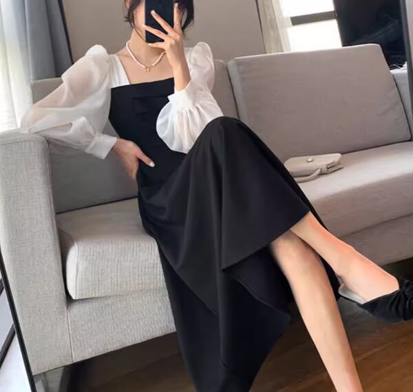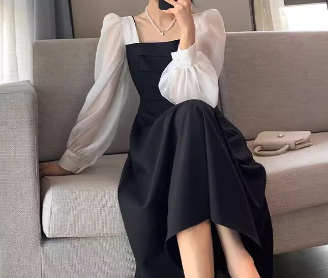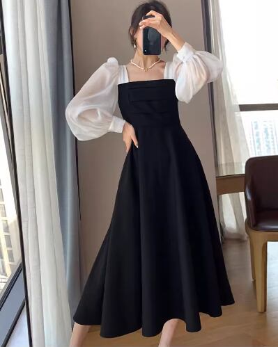 レディース プルオーバー ドレス ミモレ 長袖 ボリューム袖 プリンセススリーブ スクエアネック 薄手 大人可愛い きれいめ シンプル 上品 おしゃれ レトロ ガーリー エレガント キュート クラシカル セクシー シック 高級感 無地 秋 デート お出かけ パーティー イベント モノトーン 普段使い 清楚 S M L XL ブラック