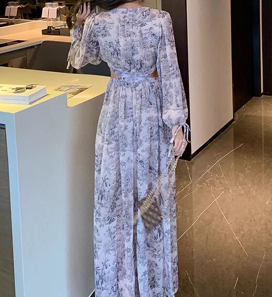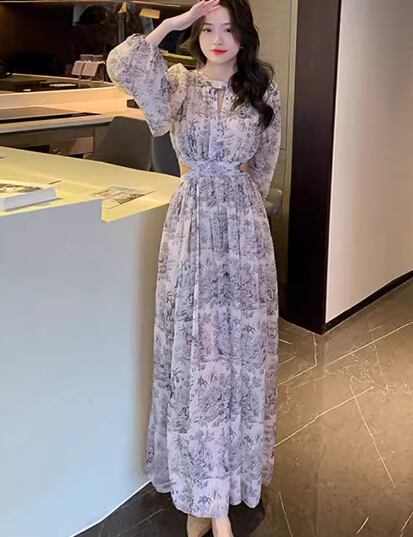 レディース ワンピース ドレス ロング マキシ 長袖 ボリューム袖 ランタンスリーブ ラウンドネック フレア Aライン フェミニン シフォン スリット ファスナー ハイウエスト 異国風 肌見せ 大人可愛い きれいめ カジュアル 上品 おしゃれ こなれ感 ガーリー 個性的 エレガント モダン 存在感 ラグジュアリー セクシー シック 高級感 華やか スタイリッシュ 花柄 フラワー プリント 秋 デート お出かけ パーティー イベント 普段使い モテ S M L XL ホワイト