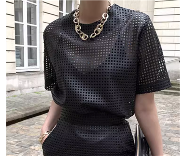 レディース トップス カットソー プルオーバー Tシャツ ショート ミドル丈 半袖 ラウンドネック レザー 透け感 大人可愛い きれいめ シンプル カジュアル 上品 おしゃれ かっこいい こなれ感 ボーイッシュ 個性的 クール モード系 エレガント モダン ラグジュアリー ハンサム シック 高級感 芸術的 アーティスティック スタイリッシュ 夏 ママ OL デート お出かけ 普段使い 着回し S M L XL ブラック ベージュ 大人デザイン