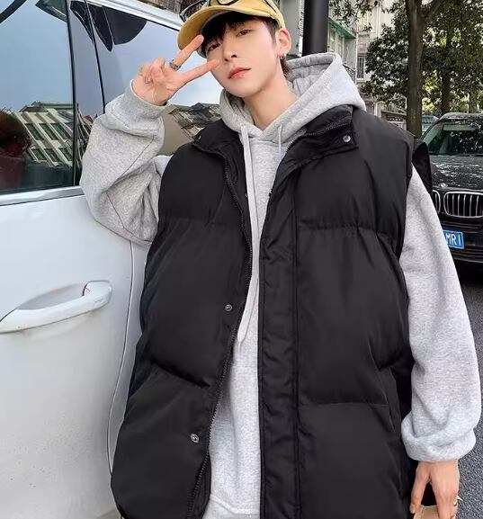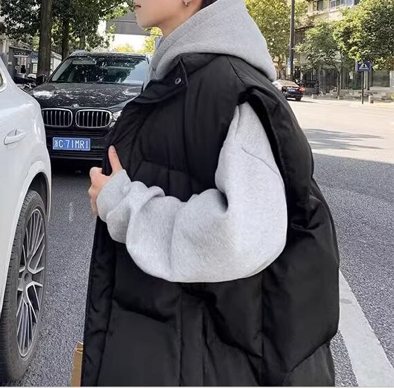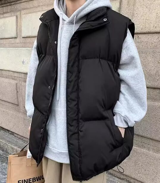 メンズ 男性用 ジャケット ベスト アウター 上着 ダウン ダウンベスト ミドル丈 袖なし ノースリーブ スタンドカラー ファスナー ポケット 前開き 伸縮性 厚手 コットン シンプル カジュアル かっこいい スポーティー ルーズ クール 存在感 ナチュラル シック 高級感 スタイリッシュ 無地 秋 冬 デート お出かけ アウトドア キャンプ 重ね着 暖かい 防寒 普段使い 着回し レイヤード トレンド 流行 M L XL ブラック アプリコット