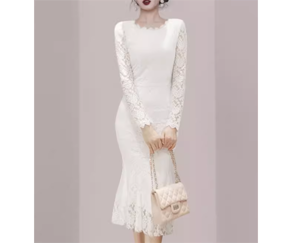レディース プルオーバー ドレス 膝下 ミモレ 長袖 ラウンドネック タイト スリム 細身 マーメイド フィッシュテール レース ファスナー ハイウエスト 大人可愛い きれいめ シンプル 上品 おしゃれ こなれ感 ガーリー エレガント ラグジュアリー ナチュラル セクシー シック 高級感 芸術的 アーティスティック 華やか 優しい 穏やか 秋 デート お出かけ パーティー イベント 普段使い 清楚 S M L 小さめ ホワイト