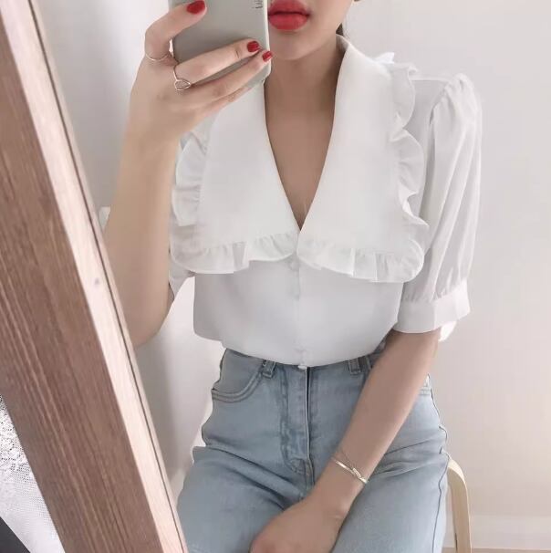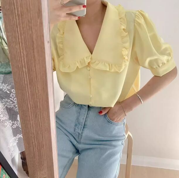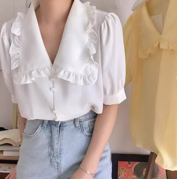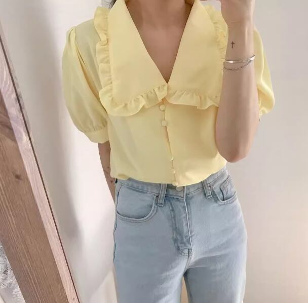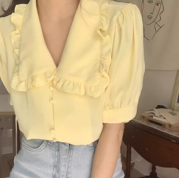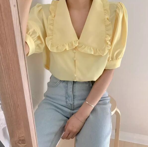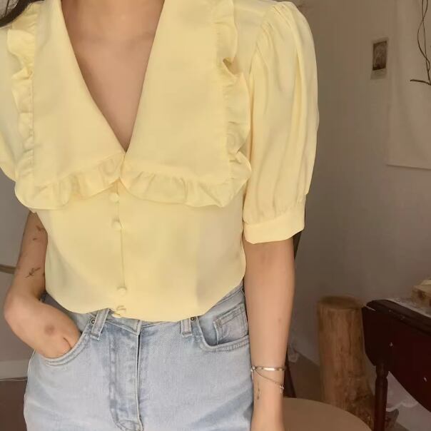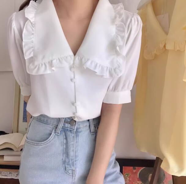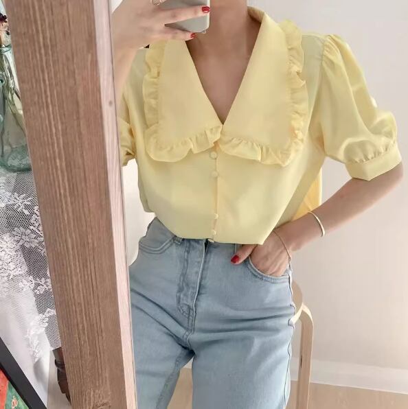 レディース トップス シャツ ブラウス 前開き ミディアム丈 半袖 バルーン袖 襟付き 角襟 ストレート フェミニン シフォン ボタン 薄手 大人可愛い きれいめ 上品 おしゃれ レトロ ガーリー エレガント 主役級 存在感 ラブリー キュート プリンセス クラシカル ロマンティック 無地 夏 OL 学生 デート お出かけ リゾート 旅行 レストラン 女子会 休日 ショッピング 韓国 オルチャン コーデ 着回し 清楚 トレンド インスタ映え S M L ホワイト イエロー