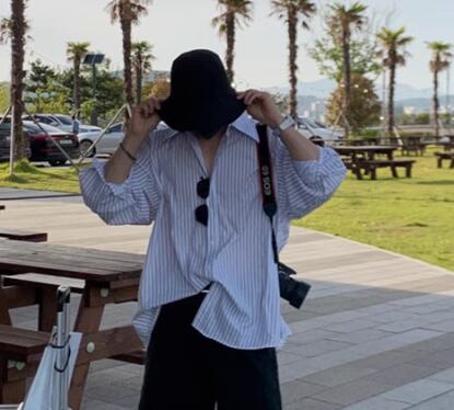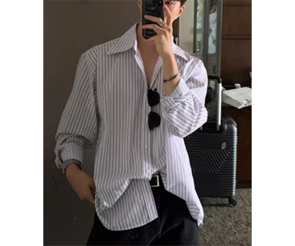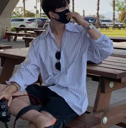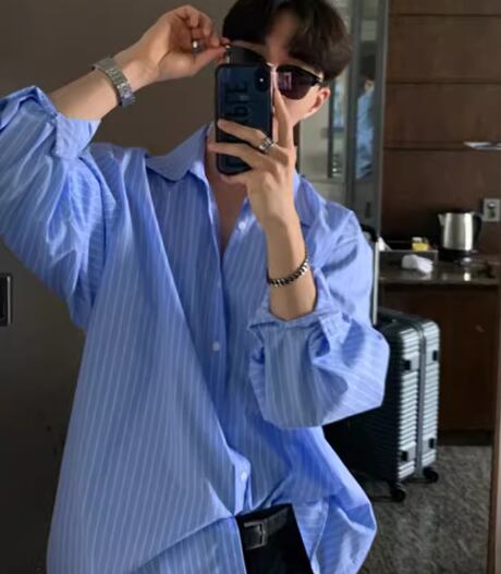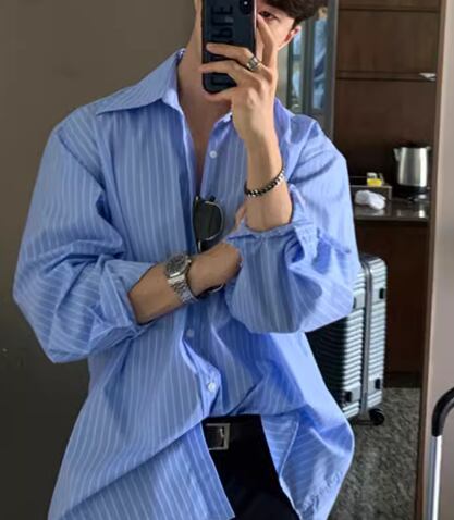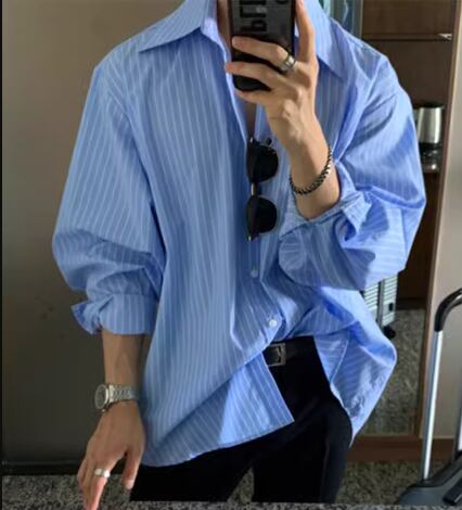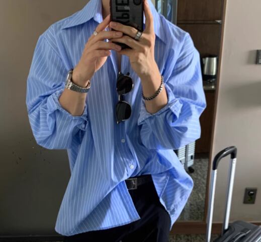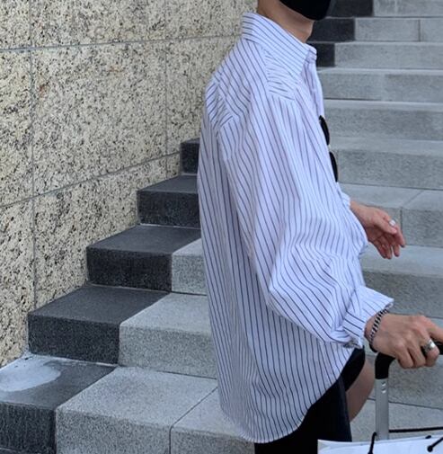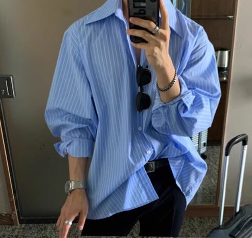 メンズ 男性用 シャツ ミドル丈 長袖 襟付き 前開き ボタン 大人可愛い カジュアル 上品 おしゃれ かっこいい ルーズ クール エレガント ナチュラル 知的 清潔感 爽やか セクシー ハンサム シック 高級感 スタイリッシュ ストライプ 秋 デート お出かけ 韓国 普段使い 着回し トレンド 流行 M L XL ゆったり ゆる 大きめ オーバーサイズ ホワイト ブルー