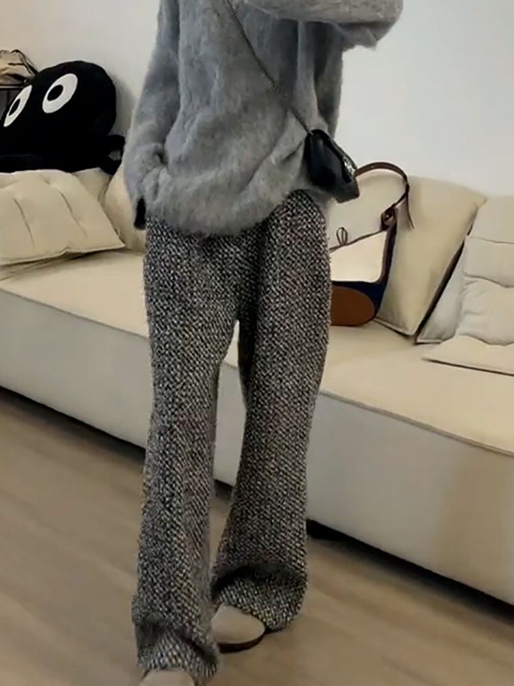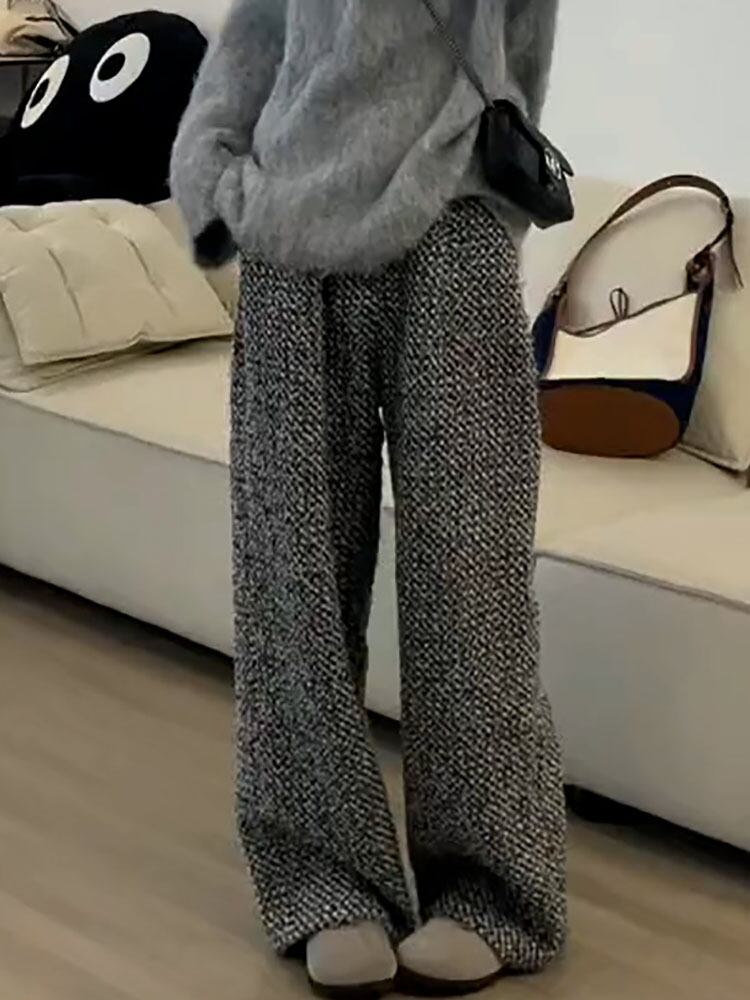 ツイード風で暖かみのある総柄ハイウェストワイドパンツ。