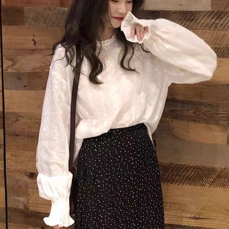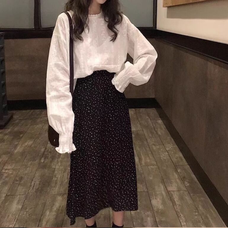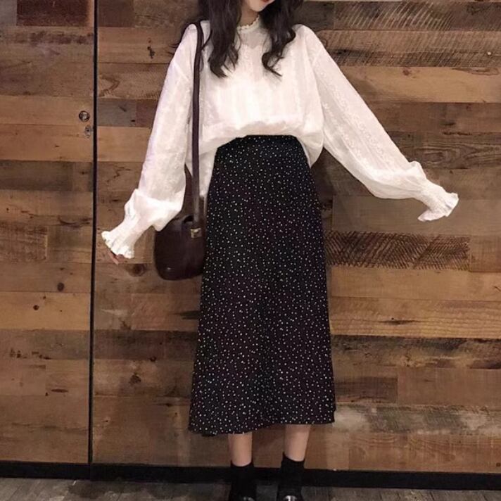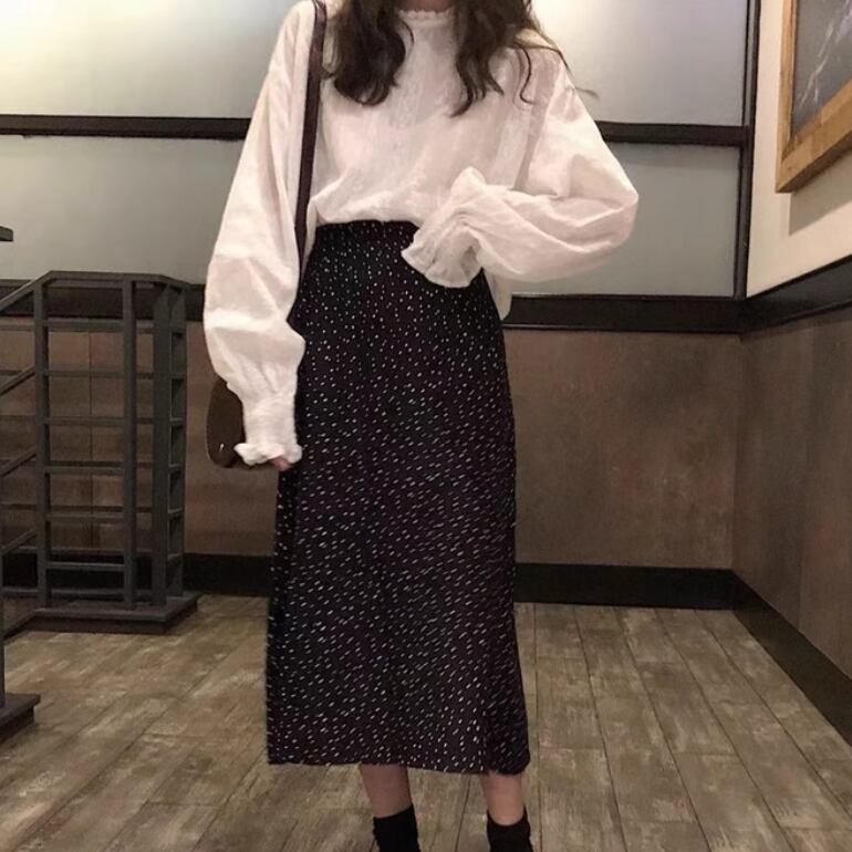 2点セット レディース スカート トップス シャツ ブラウス セットアップ ロングスカート ツーピーストップス ミモレ 長袖 萌袖 フリル袖 襟付き スタンドカラー ハイウエスト 薄手 かわいい 大人可愛い きれいめ シンプル カジュアル 上品 おしゃれ かっこいい レトロ アジアン こなれ感 ラフ ルーズ 個性的 クール モード系 エレガント モダン 主役級 存在感 とろみ感 抜け感 ラブリー キュート 都会的 ロマンティック ドット柄 水玉 春 秋 デート お出かけ 休日 お花見 コーデ モテ 清楚