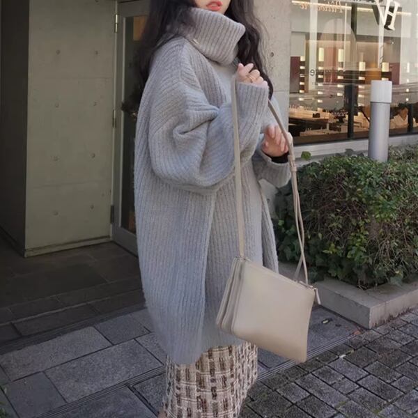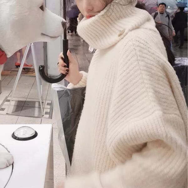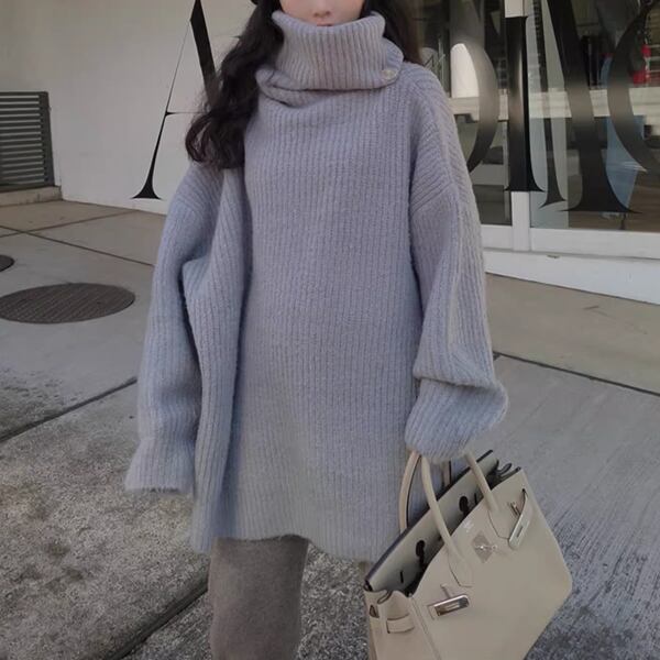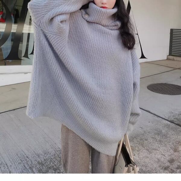 この「韓国スタイルのハイカラールーズプルオーバー」は、秋から冬までの季節に最適なアウターニットトップです。ルーズでミッドレングスのデザインは、女性の脂肪をカバーしつつ、スタイリッシュな印象を与えます。高い保温性と快適な着心地で、暖かさとファッションを両立させた一枚です。