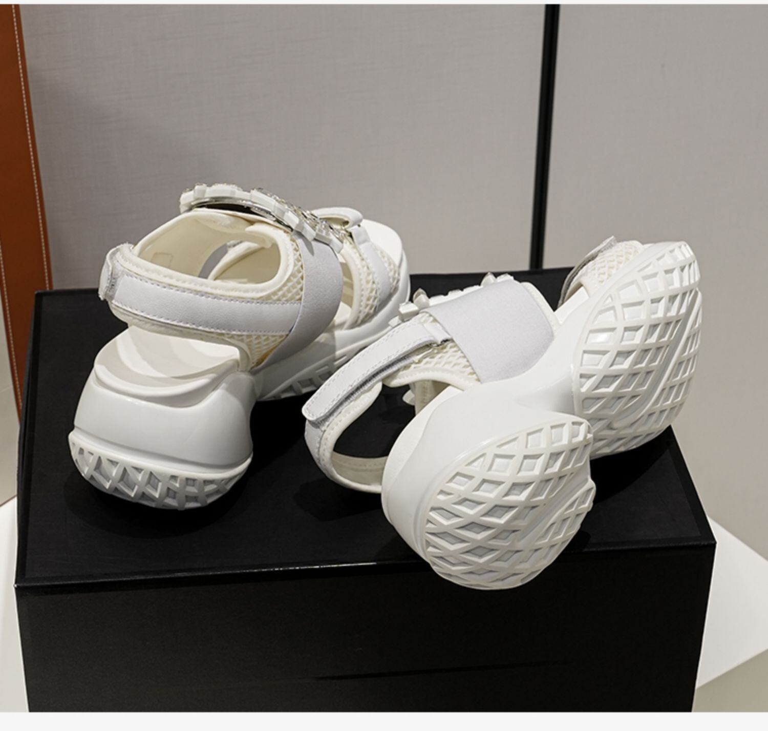 華やかなビジュー付き厚底ボリュームソールサンダル。