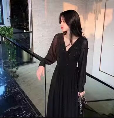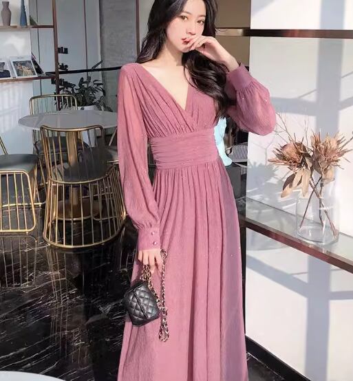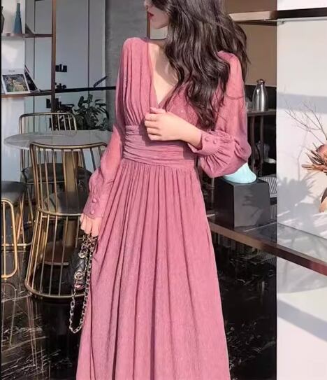 レディース ワンピース プルオーバー ドレス ロング 長袖 Vネック Aライン フェミニン プリーツ ウエストマーク ハイウエスト かわいい 大人可愛い きれいめ シンプル 上品 おしゃれ ガーリー エレガント キュート ラグジュアリー セクシー 高級感 高貴 無地 春 秋 デート お出かけ パーティー イベント 普段使い 清楚 S M L XL ブラック ピンク レッド キラキラ