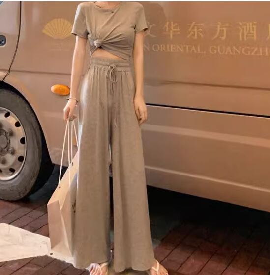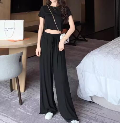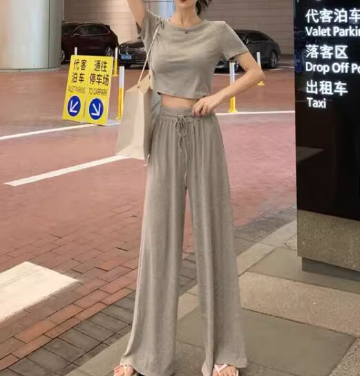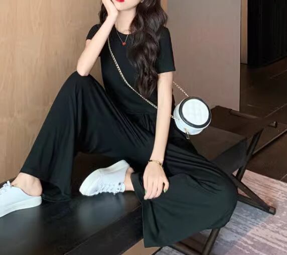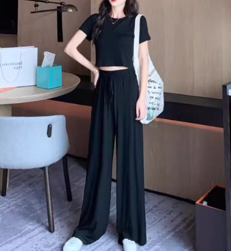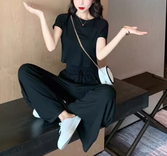 ショート丈の半袖Tシャツとフルレングスのワイドパンツの二点セットです。