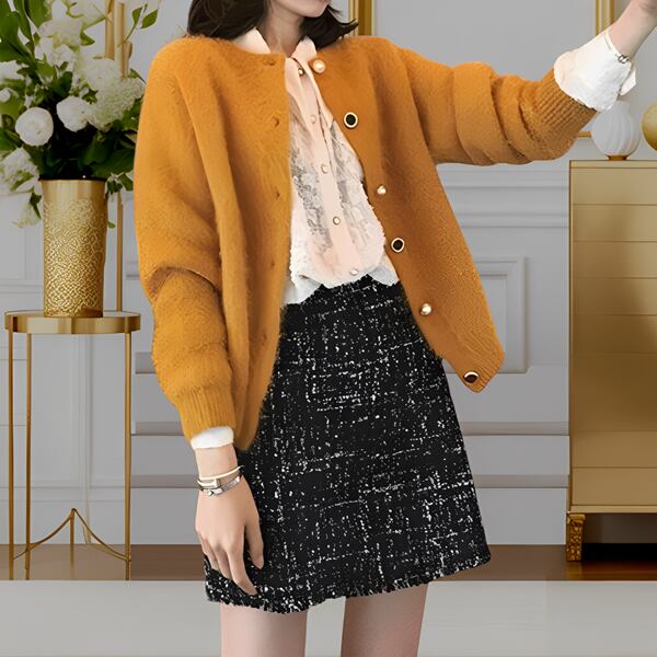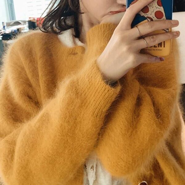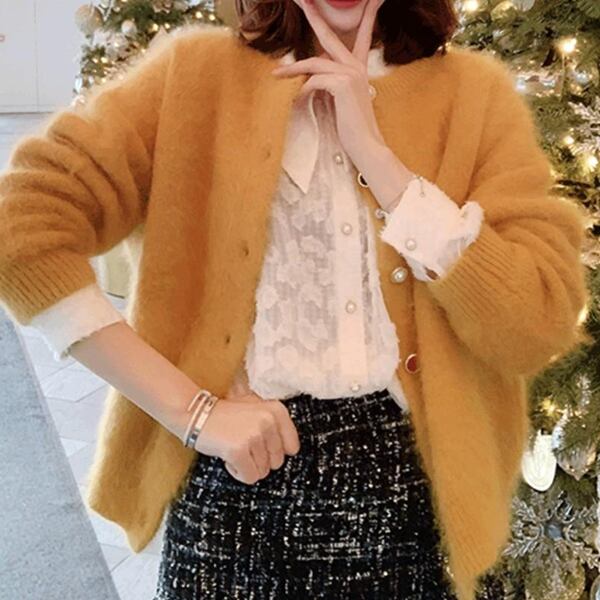 「ミンクベルベットセーターカーディガン」レディース トップス カーディガン プルオーバー 上着 長袖 ラウンドネック ノーカラー ストレート ボタン リブニット ベルベット 大人可愛い 上品 エレガント 無地 春 20代 30代 通勤 お出かけ イベント レストラン ショッピング 韓国 ゆったり イエロー シングルブレストレギュラースリーブ長さレギュラー糸スプライシング