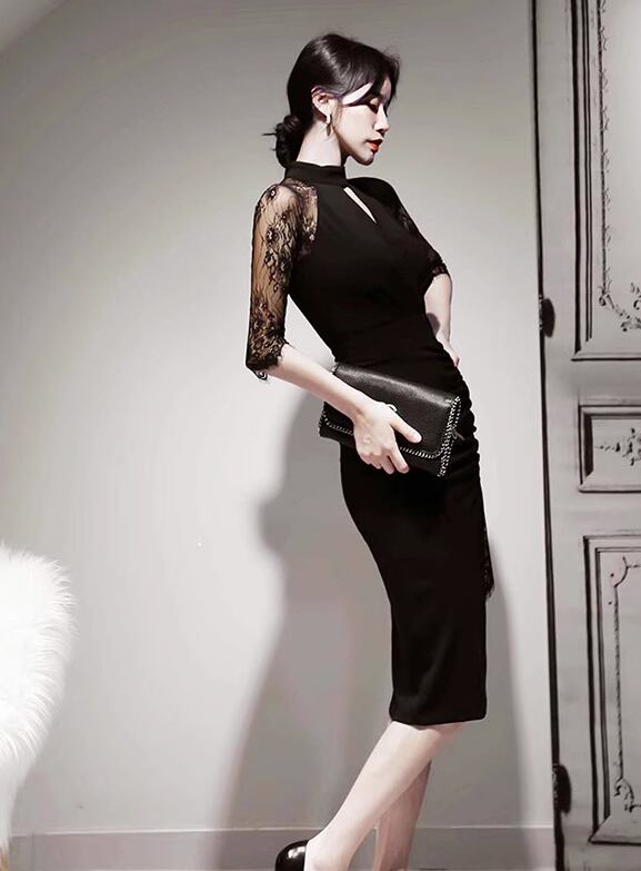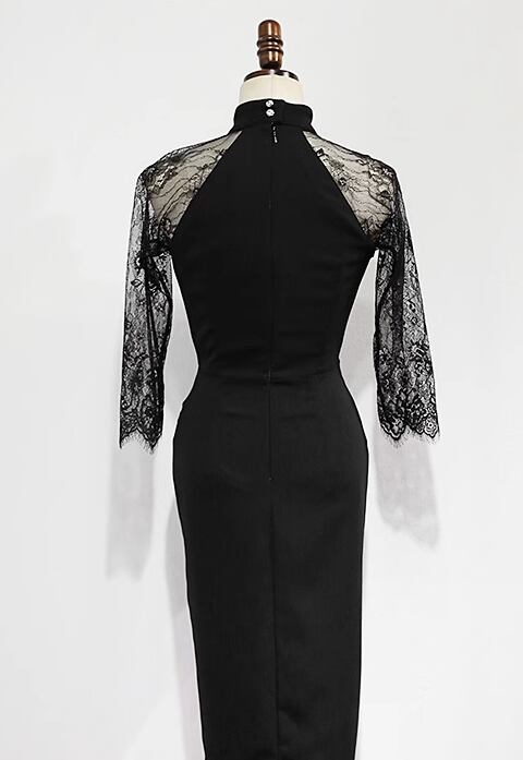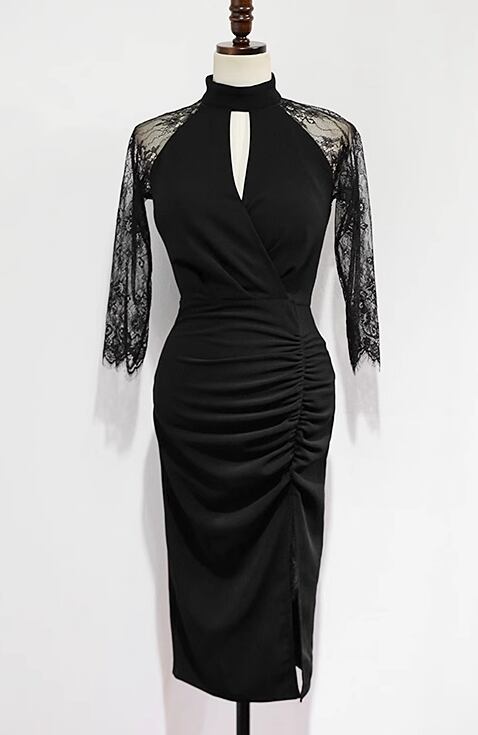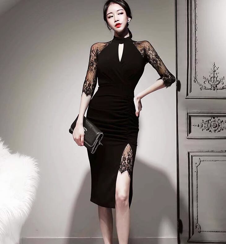 ドレス イブニングドレス パーティー 結婚式 二次会 披露宴 ステージ フォーマル キャバ ラウンジ クラブ 膝丈 7分袖 袖あり カシュクール ホルターネック 襟なし スリム 細身 イブニング レース スリット ファスナー ハイウエスト 透け感 可愛い きれいめ シンプル 大人可愛い 上品 おしゃれ エレガント 主役級 存在感 フォーマル エレガント セクシー シック 無地 二の腕カバー 美脚 脚長 高見え プチプラ 春 夏 秋 S M L XL 秋カラー 大人カラー 黒 ブラック