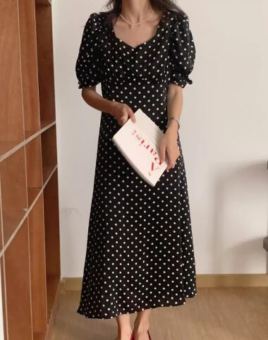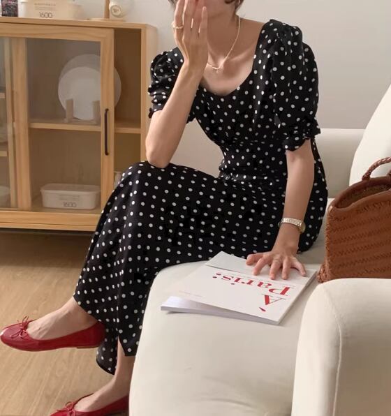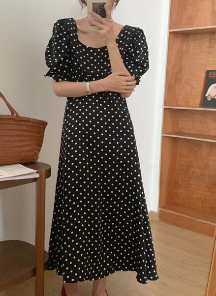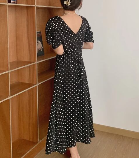 レディース プルオーバー ドレス ワンピース ロング 半袖 ボリューム袖 パフスリーブ スクエアネック スリム 細身 Aライン 背中開き フェミニン バックリボン ハイウエスト サテン かわいい 大人可愛い きれいめ カジュアル 上品 おしゃれ レトロ ガーリー エレガント 存在感 キュート ナチュラル 清潔感 セクシー シック 高級感 華やか ドット柄 水玉 夏 10代 20代 学生 デート お出かけ パーティー イベント 清楚 S M ブラック オフホワイト