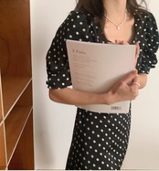上品でレトロな水玉模様が可愛らしい、半袖のロングドレス。