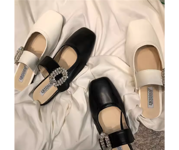 キラキラと輝くラインストーンがアクセントになった大人可愛いミュールサンダル。