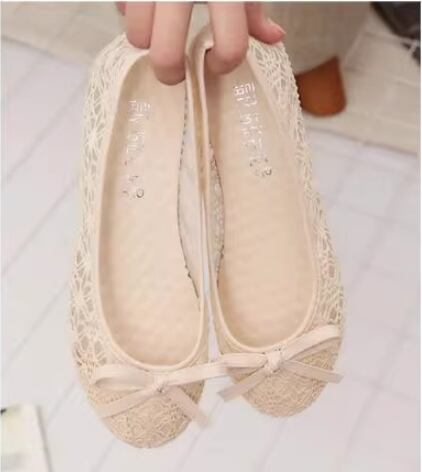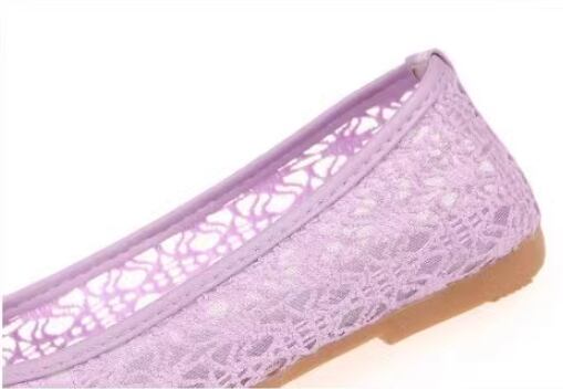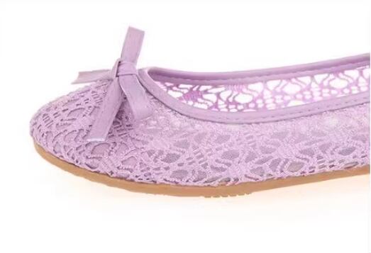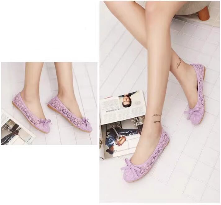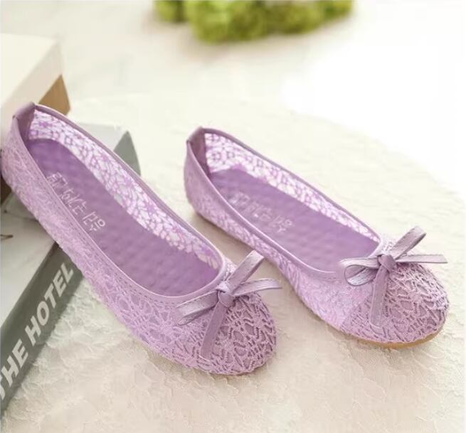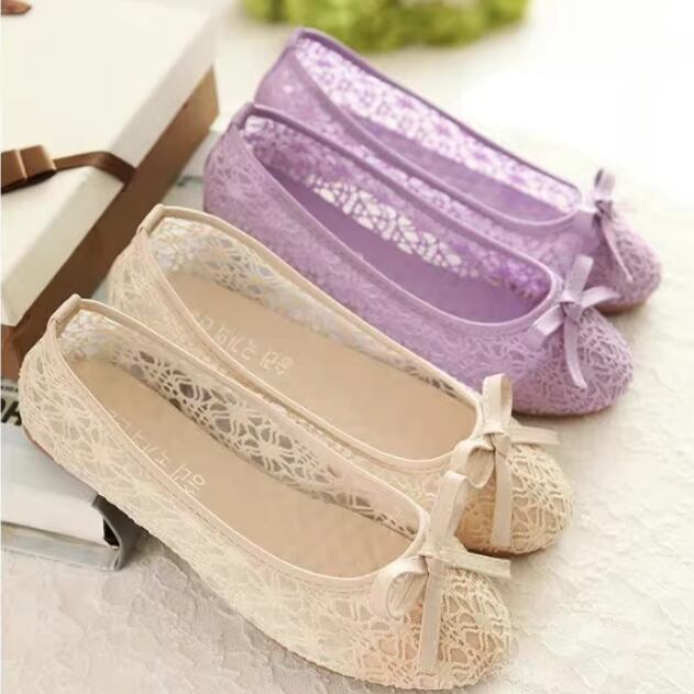 大人可愛いリボン付きレースフラットバレエシューズ。