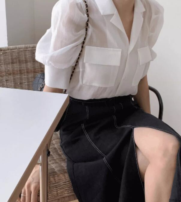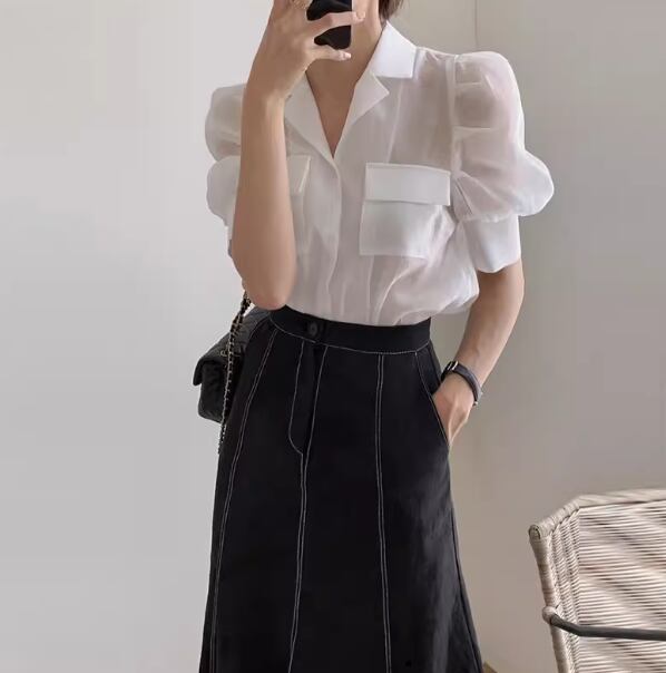 レディース シャツ ブラウス ミディアム丈 半袖 5分袖 バルーン袖 Vネック 襟付き ストレート フェミニン シフォン ポケット 薄手 きれいめ シンプル 上品 おしゃれ かっこいい 個性的 エレガント 主役級 存在感 プリンセス クラシカル ロマンティック 無地 夏 ママ オフィス ビジネス OL 通勤 学生 リゾート 旅行 レストラン 女子会 休日 バカンス ホテル 合コン コンパ カフェ 婚活 コーデ 体型カバー 普段使い 着回し インスタ映え S M L XL ホワイト