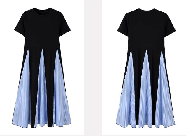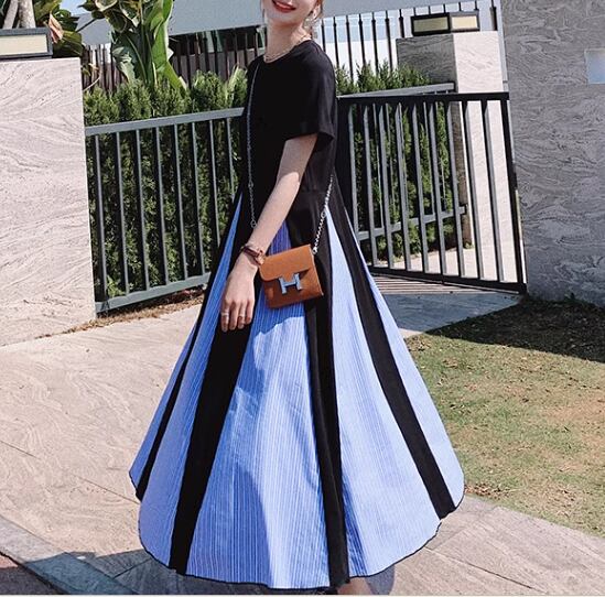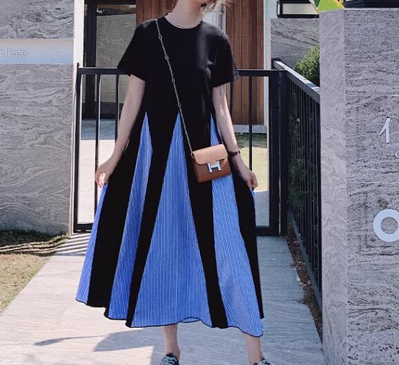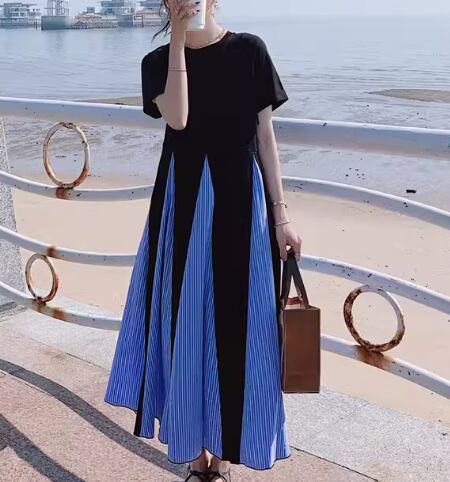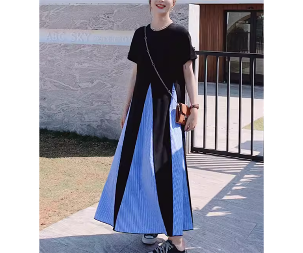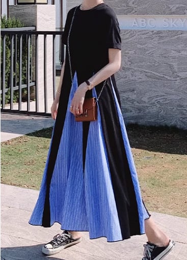 ブラック×ライトブルーのカラー配色がとても可愛い半袖のロング丈ワンピース。