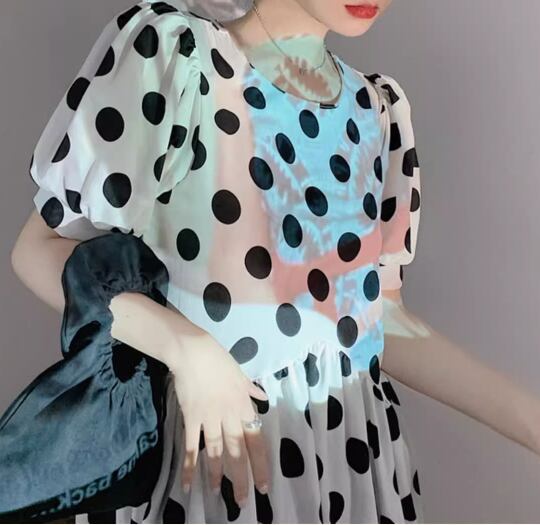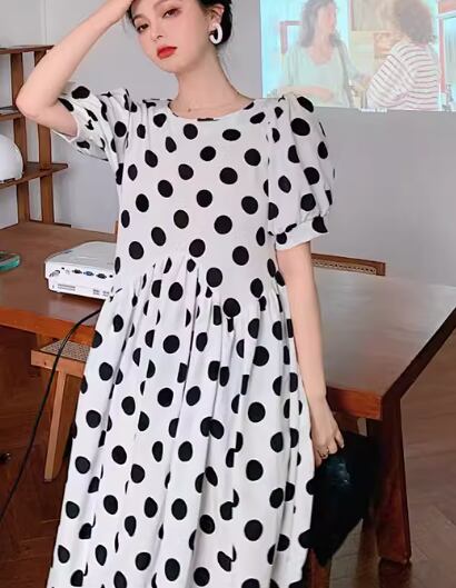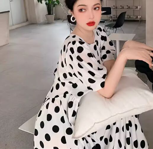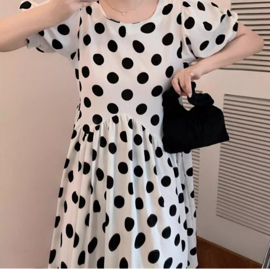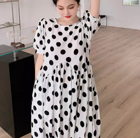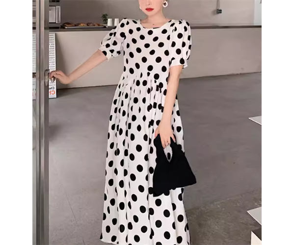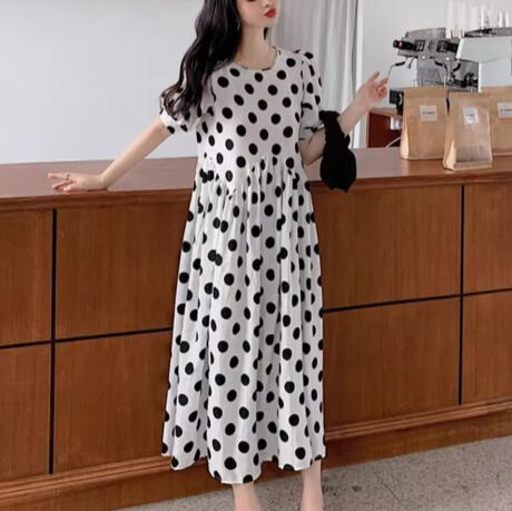 大きめの水玉模様が可愛らしい半袖のロングドレス。