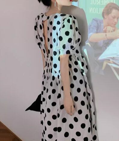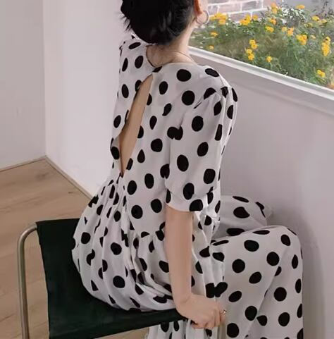 レディース ワンピース プルオーバー ドレス ロング 半袖 ラウンドネック 背中開き 切り替えデザイン かわいい カジュアル 上品 おしゃれ レトロ ガーリー 個性的 存在感 ラブリー キュート ラグジュアリー クラシカル セクシー シック 高級感 スタイリッシュ 水玉 夏 デート お出かけ モノトーン 普段使い S M L XL ホワイト