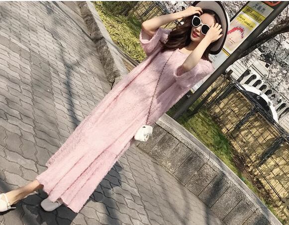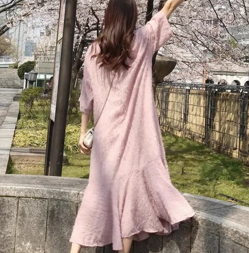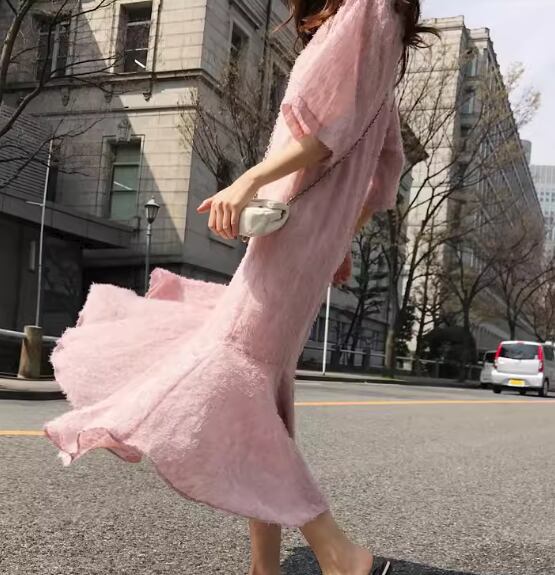 まるで桜を連想させるような淡いピンク色が女性らしくて可愛い、半袖のロングワンピース。