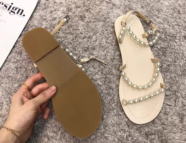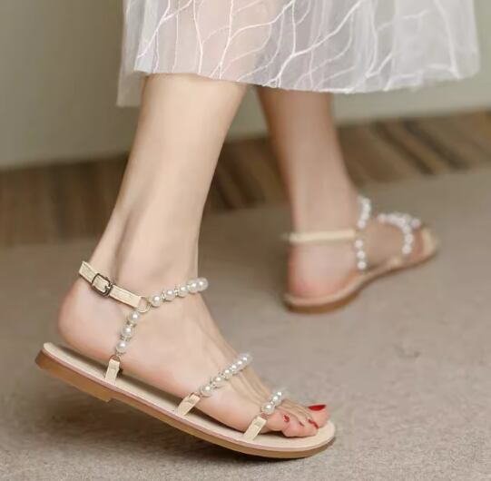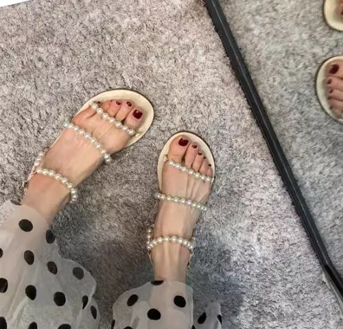 たくさんのパールが華やかで可愛らしい、ストラップ付きのフラットサンダル。