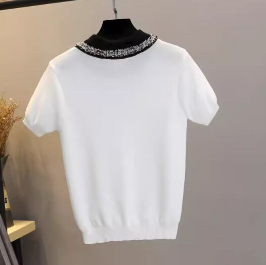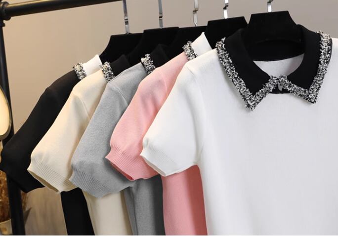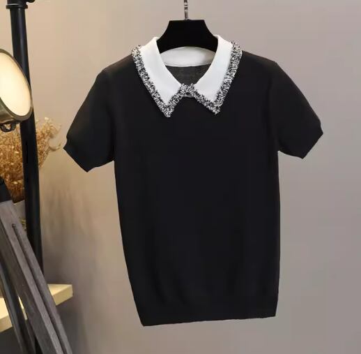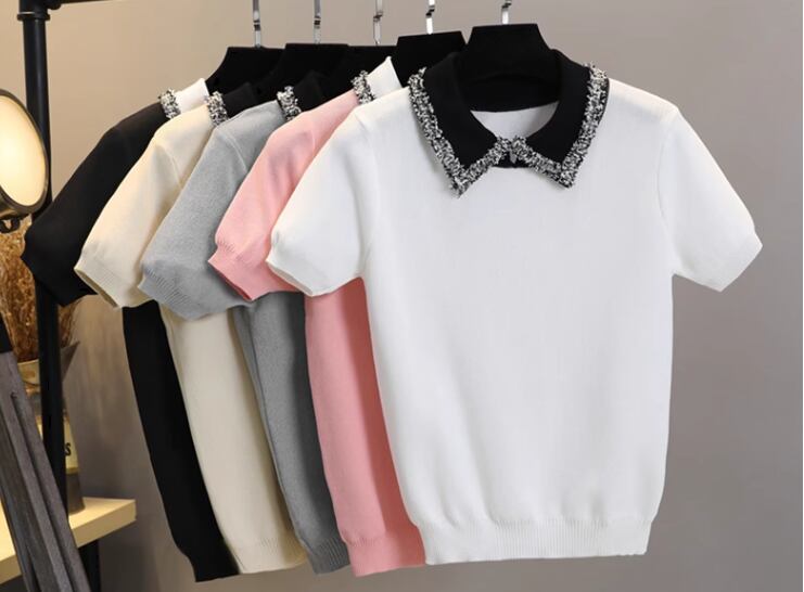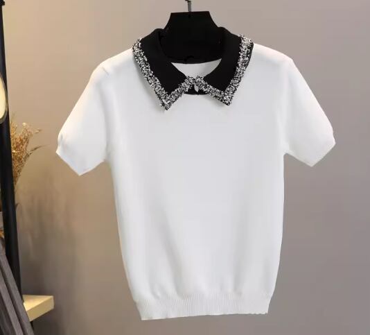 襟のデザインがエレガントでおしゃれな半袖のポロシャツ。