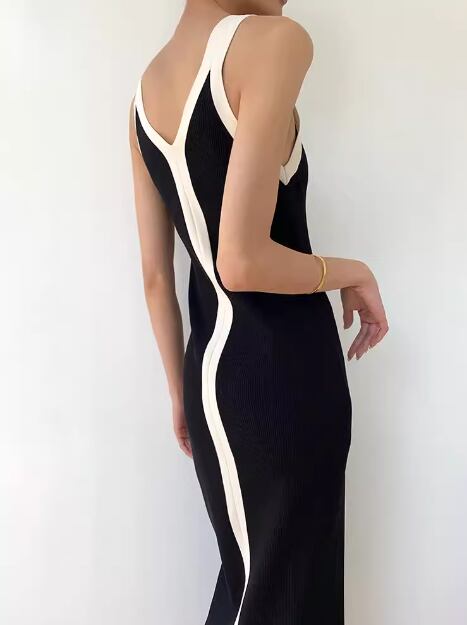 ブラック×ホワイトのシックなモノトーンカラーが大人っぽいノースリーブのロングドレス。