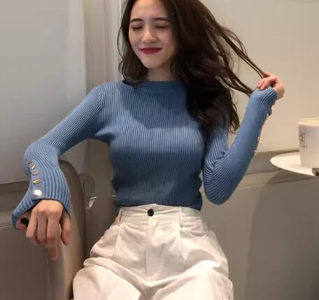 スマートなシルエットと袖口の金ボタンが大人可愛い、長袖のニットセーター。