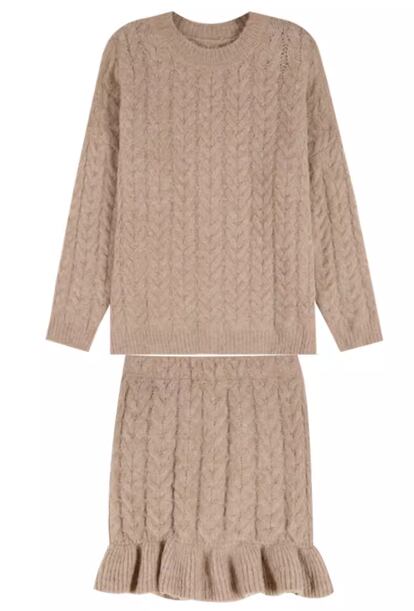 長袖のニットセーターとショート丈のニットスカートの二点セットです。