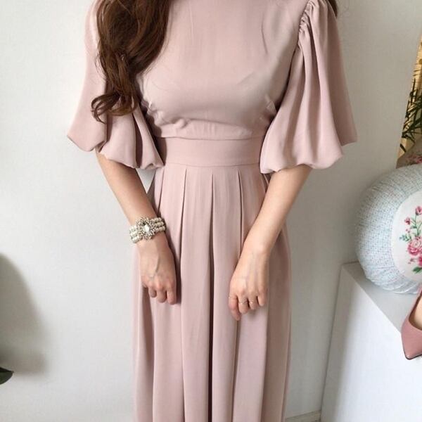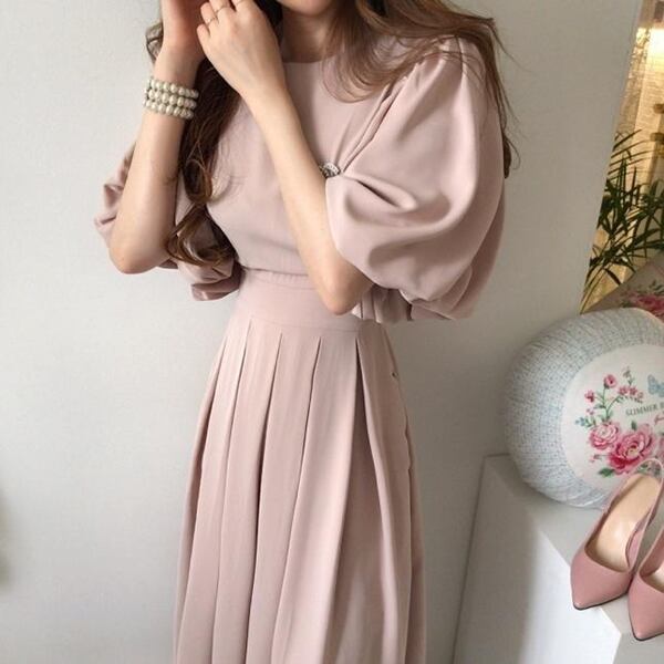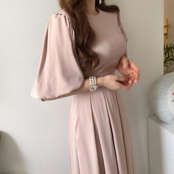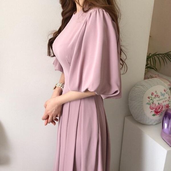2色展開 レディースロングドレス ワンピース ドレス プリーツスカート ミモレ ロング 5分袖 ランタンスリーブ ラウンドネック ノーカラー セミフレア スリム Aライン プリーツ ハイウエスト かわいい 大人可愛い 上品 おしゃれ エレガント フォーマル 無地 シーズンレス 20代 30代 オフィス ビジネス 通勤 韓国
