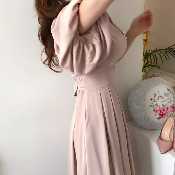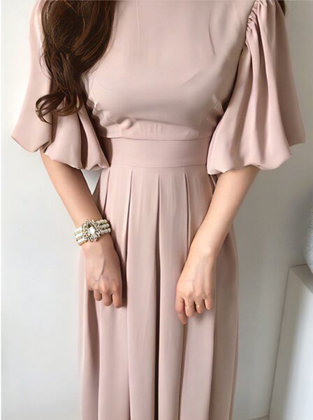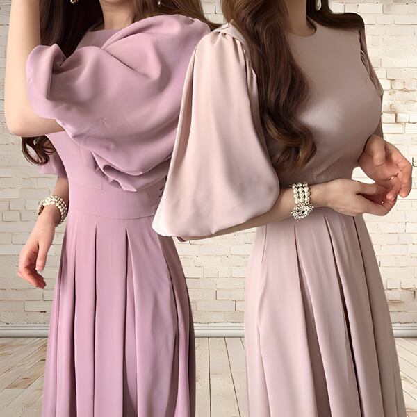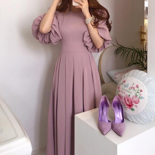 このレディースロングドレスは、多彩な要素が調和したエレガントな一着です。プリーツスカートが女性らしさを引き立て、ランタンスリーブが上品な印象を添えます。オフィスや通勤など幅広いシーンで活躍し、20代や30代の女性にもおすすめ。韓国ファッショントレンドを取り入れつつ、かわいさと上品さを両立させた一着です。