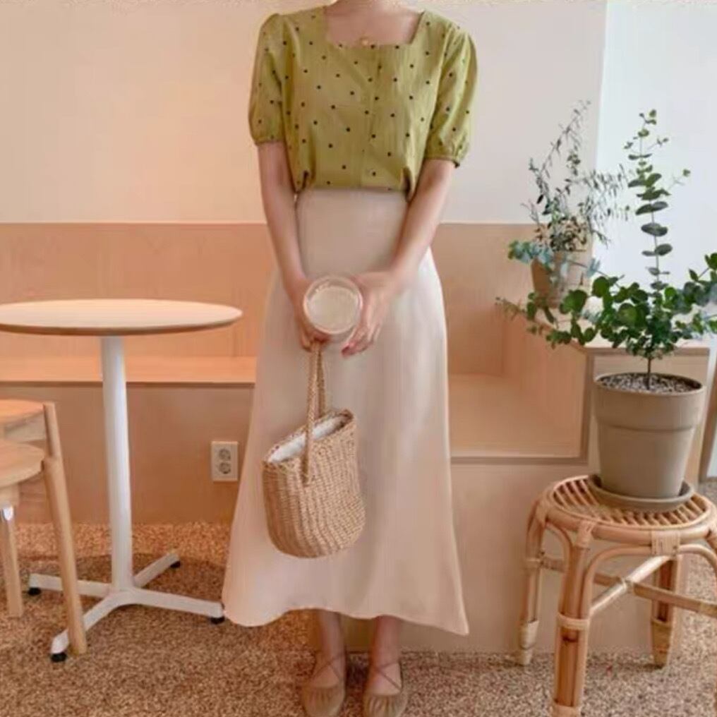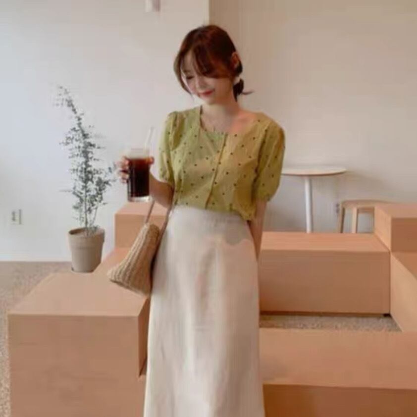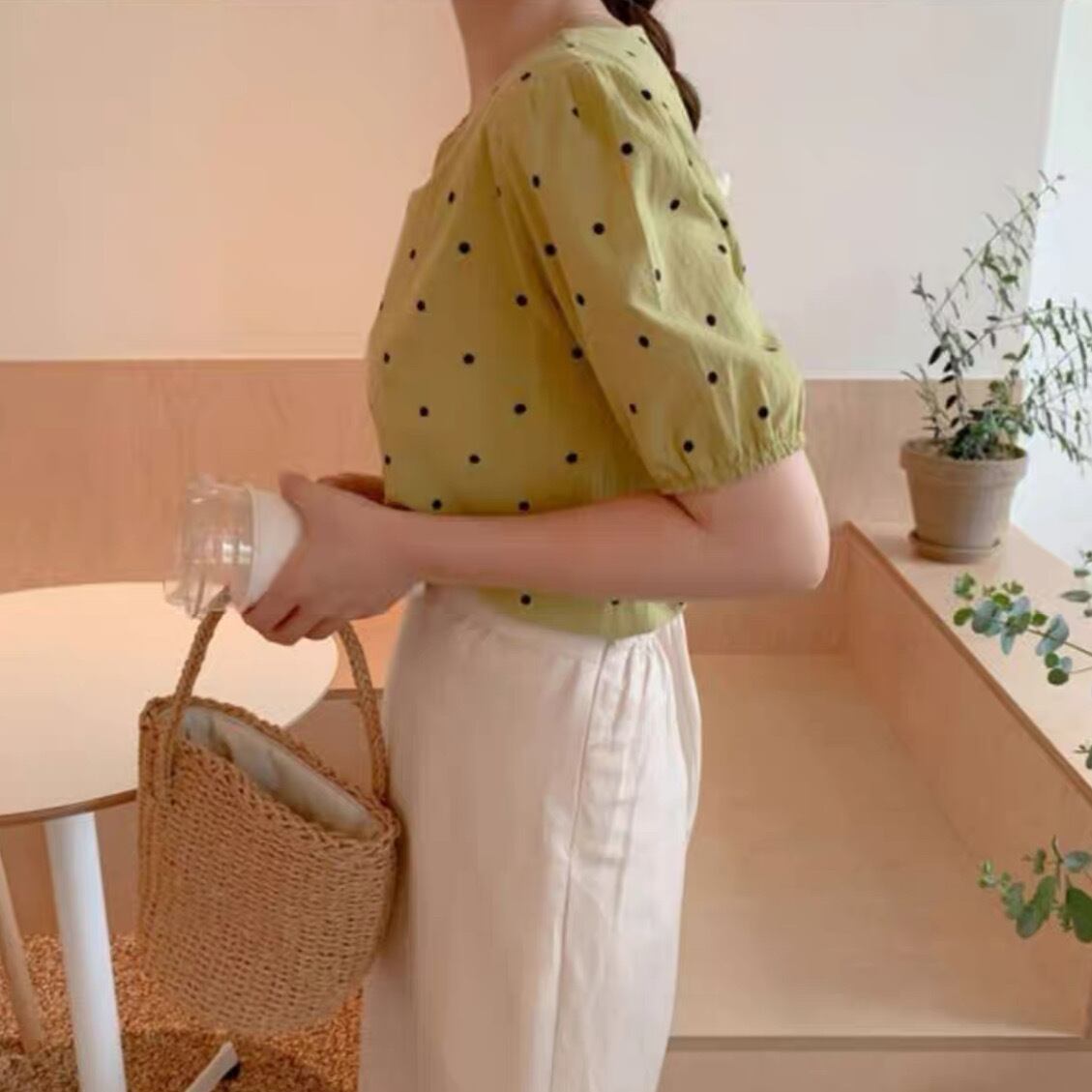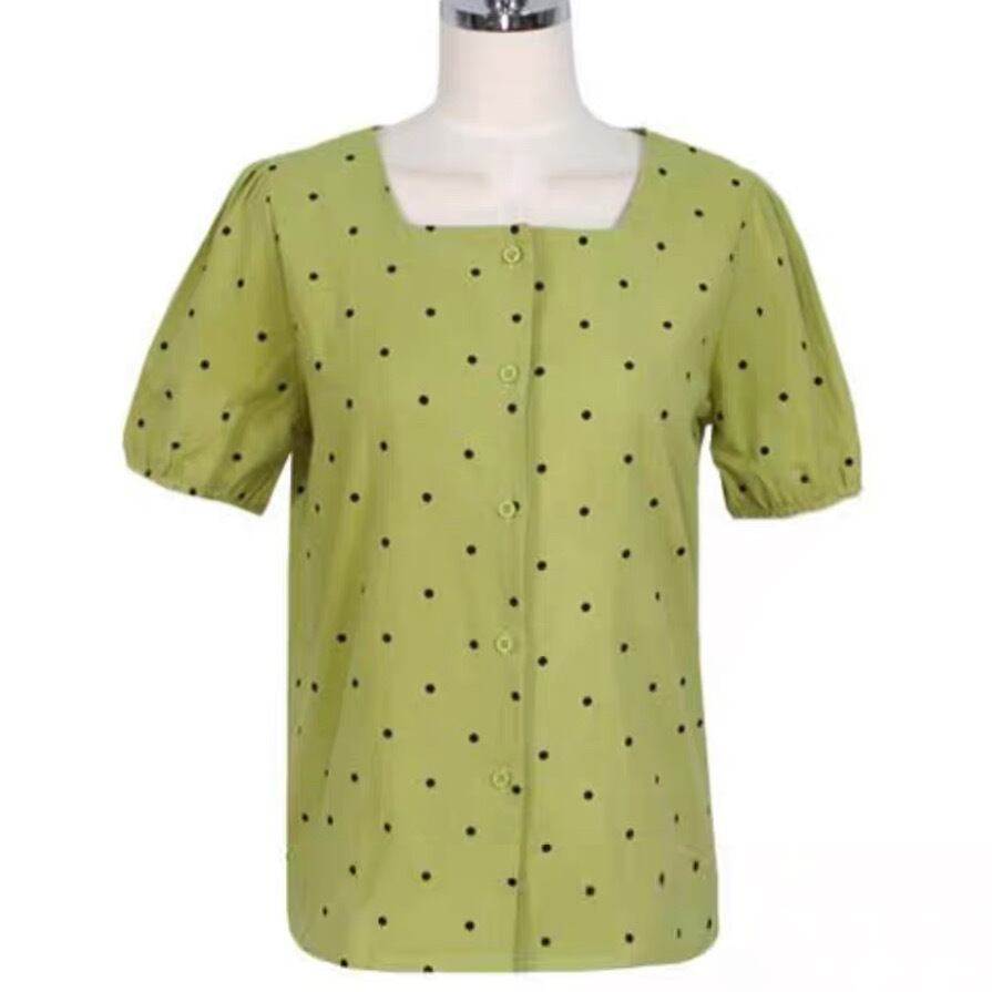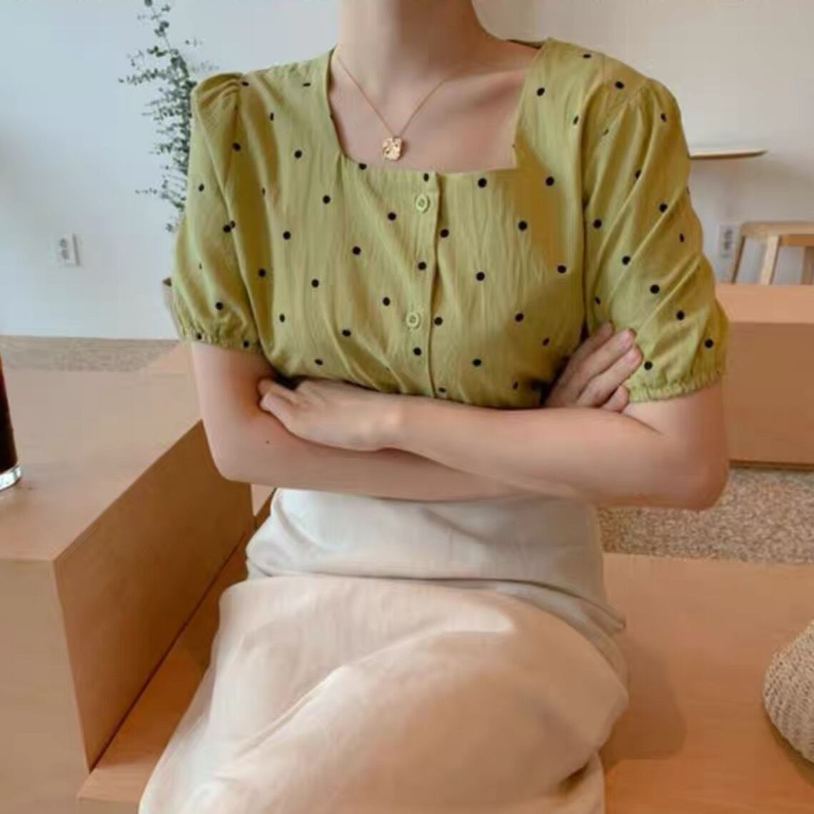 レディース トップス シャツ 半袖シャツ デザインシャツ 半袖 パフスリーブ スクエアネック フェミニン 前開き ボタン かわいい 大人可愛い きれいめ シンプル カジュアル 上品 おしゃれ レトロ ガーリー ラブリー キュート プリンセス クラシカル ロマンティック ドット柄 水玉 春 夏 通勤 オフィス OL デート お出かけ 女子会 休日 ショッピング 韓国 オルチャン コーデ コーディネート 普段使い 着回し モテ スタイル デイリー サイズ S M L XL カラー 白 ホワイト 緑 グリーン