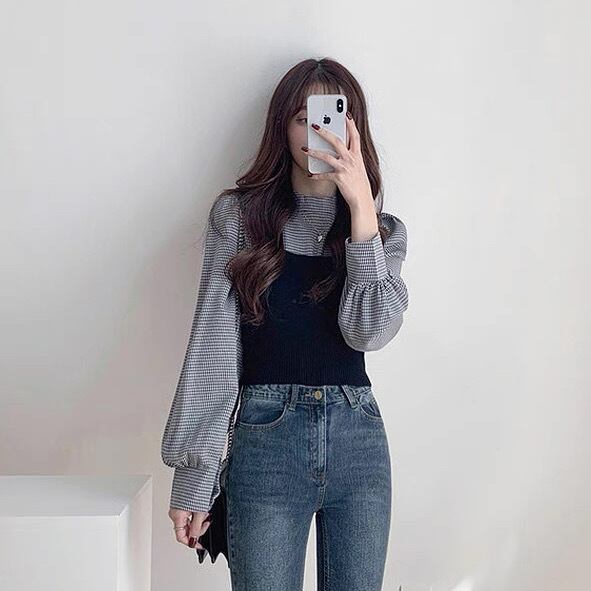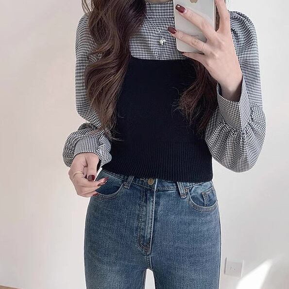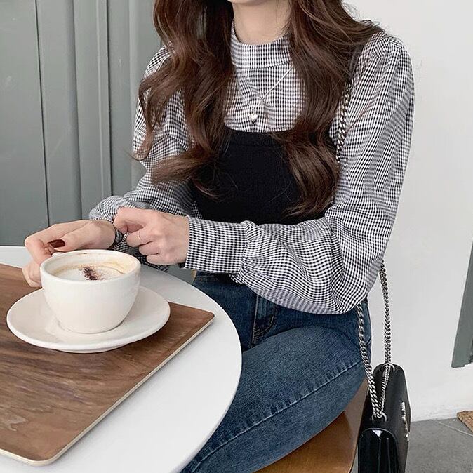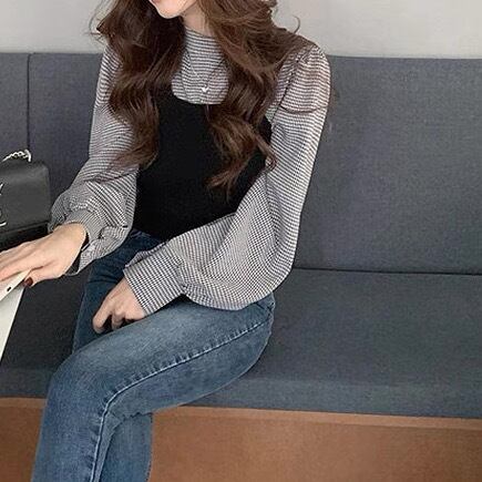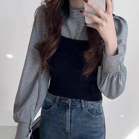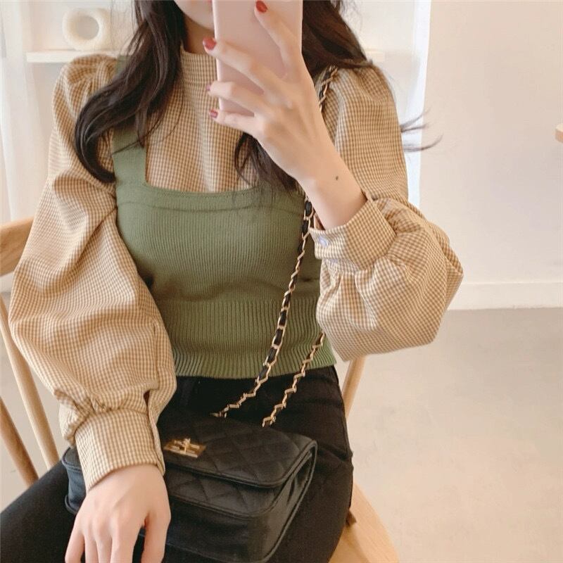 レディース トップス ブラウス ベスト セットアップ ツーピーストップス ビスチェ 2点セット 長袖 パフスリーブ バルーン袖 ハイネック フェミニン 大人可愛い きれいめ シンプル おしゃれ こなれ感 クール 抜け感 カレッジ風 学生風 シック 無地 チェック 格子柄 秋 学生 通学 デート お出かけ 公園 女子会 休日 ショッピング カフェ モノトーン 重ね着 韓国 オルチャン コーデ 普段使い 着回し レイヤード スタイル デイリー サイズ M L 2XL 大きいサイズ ブラック カーキ 秋カラー