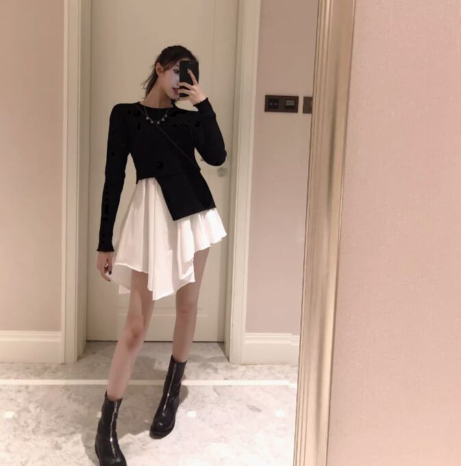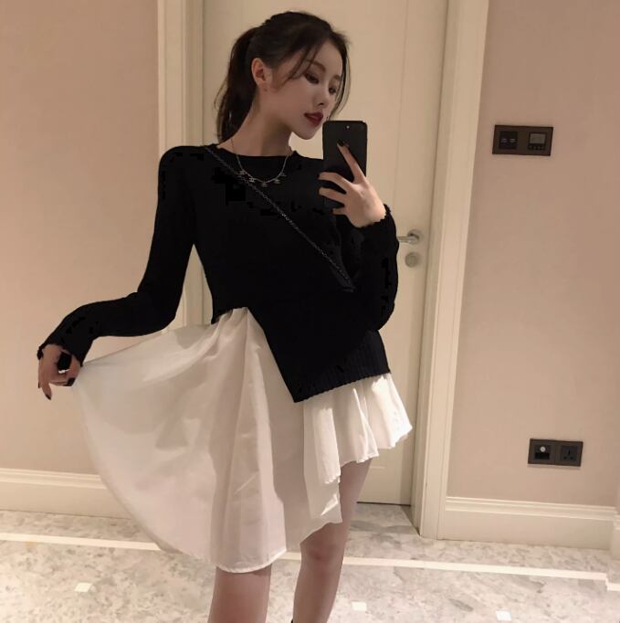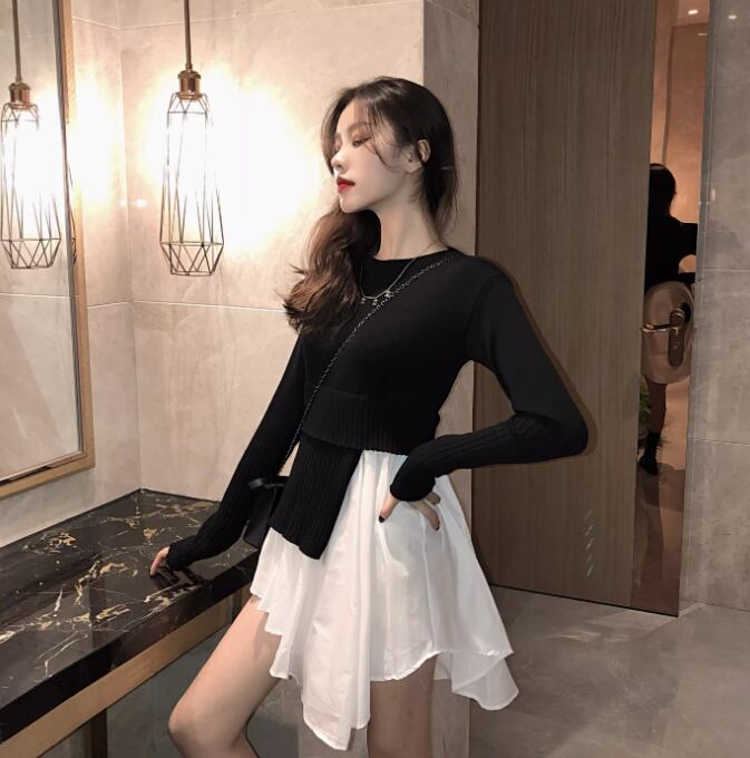 レディース ワンピース ニット プルオーバー ドレス フレア ニットワンピ ミニ 膝上 長袖 ラウンドネック フレア アシンメトリー 切り替え ドッキング フェミニン シフォン フリル 薄手 大人可愛い きれいめ カジュアル 上品 おしゃれ ガーリー ルーズ 個性的 エレガント モダン 主役級 存在感 キュート 都会的 ロマンティック 無地 冬 OL デート お出かけ リゾート 旅行 女子会 休日 ガーデン 合コン コンパ 体型カバー トレンド インスタ映え S M L XL ブラック