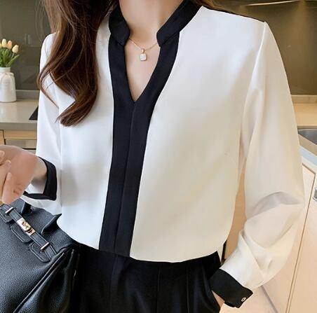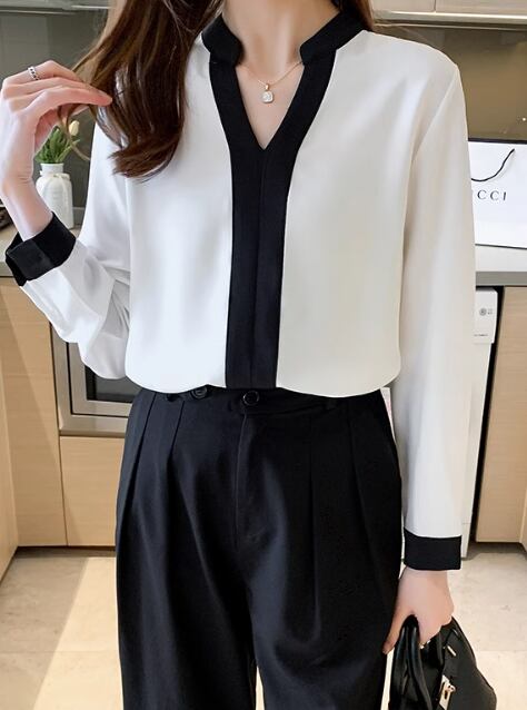 レディース トップス ブラウス バイピング 長袖 Vネック スリム 細身 ストレート 薄手 かわいい シンプル カジュアル フォーマル とろみ感 ラブリー 都会的 無地 春 オフィス ビジネス OL 通勤 デート お出かけ 重ね着 S M L XL 白 ホワイト