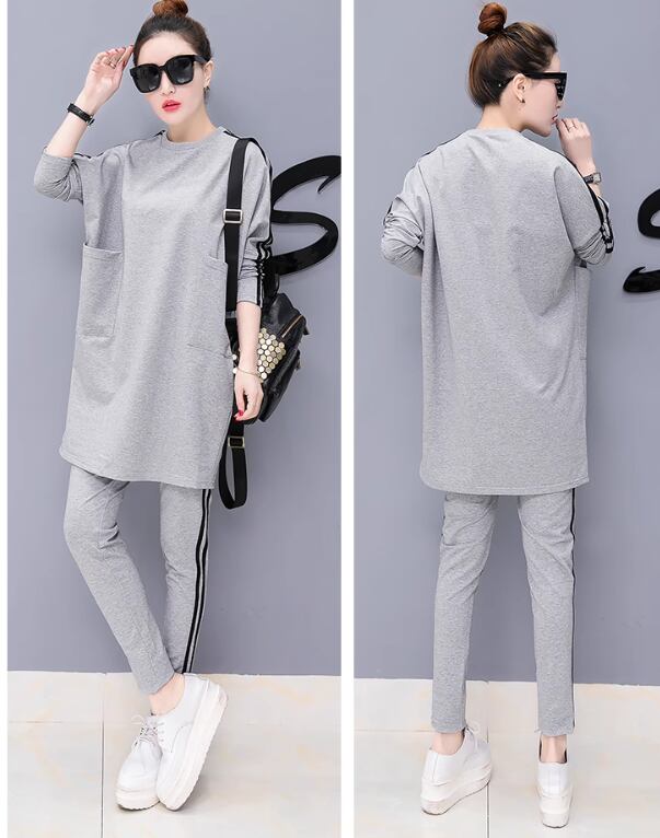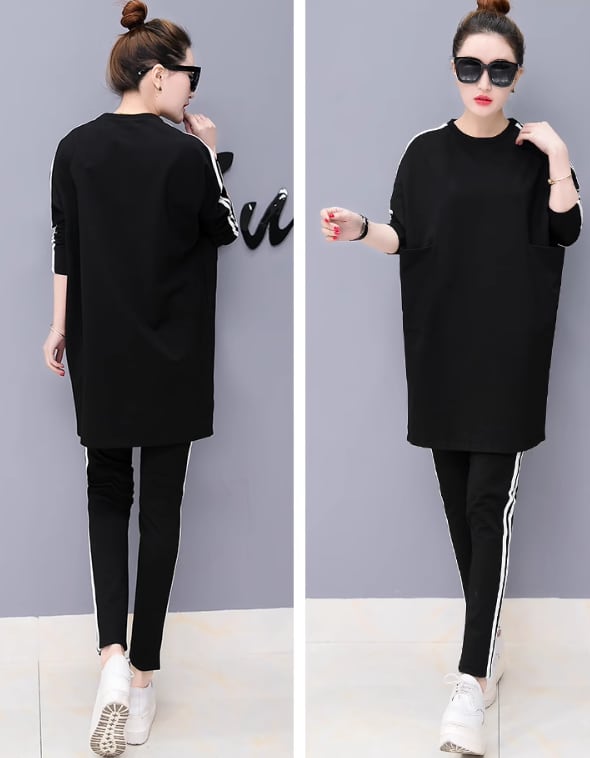 二点セット 上下セット レディース スウェット 部屋着 セットアップ 長袖 Uネック 細身 切り替え ポケット ウエストゴム 伸縮性 こなれ感 ラフ ボーイッシュ スポーティー 無地 オールシーズン 休日 韓国 オルチャン 楽ちん 普段使い 定番 M L XL 2XL 3XL 黒 ブラック グレー