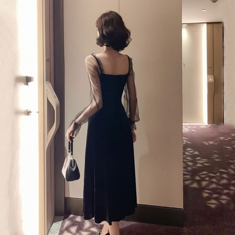 レディース ドレス パーティードレス イブニングドレス フレア 結婚式 二次会 披露宴 ミモレ 長袖 スクエアネック Aライン レース ファスナー 透け感 シースルー 背中開き シンプル 大人可愛い 上品 クール エレガント セクシー 無地 パーティー ホテル デート 二の腕カバー 美脚 結婚式 披露宴 パーティー XS 2XL 3XL S M L XL スリム ブラック