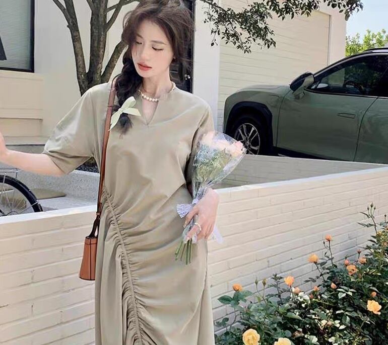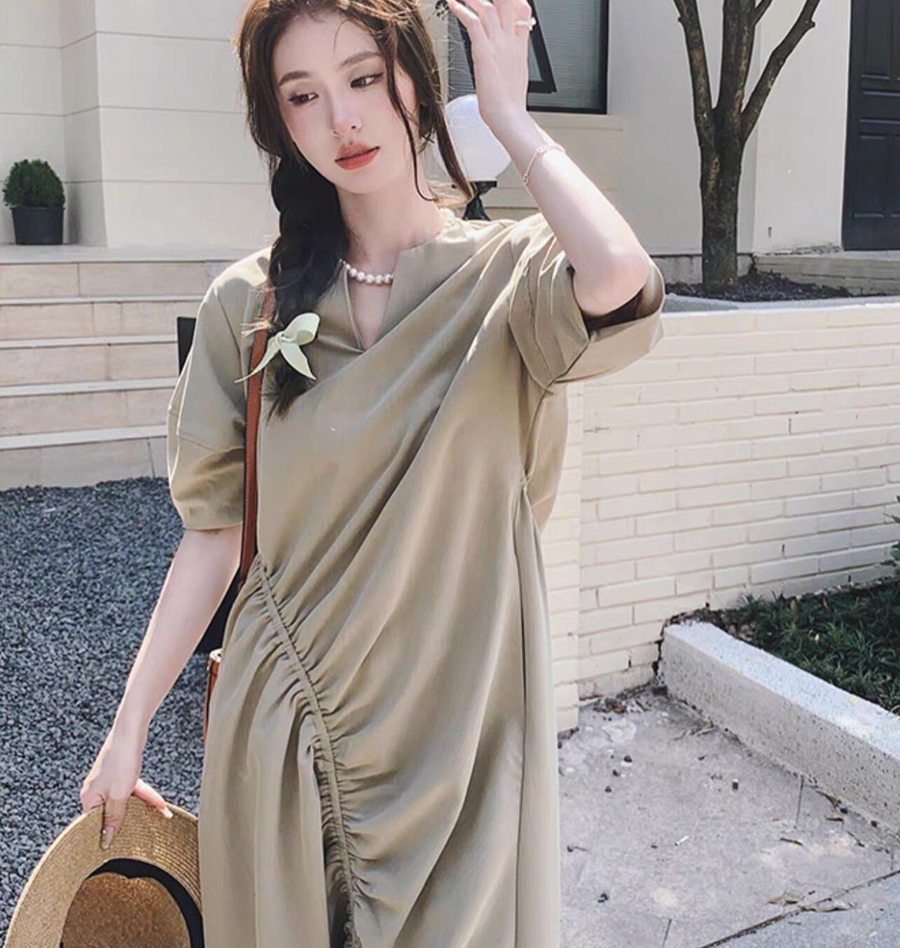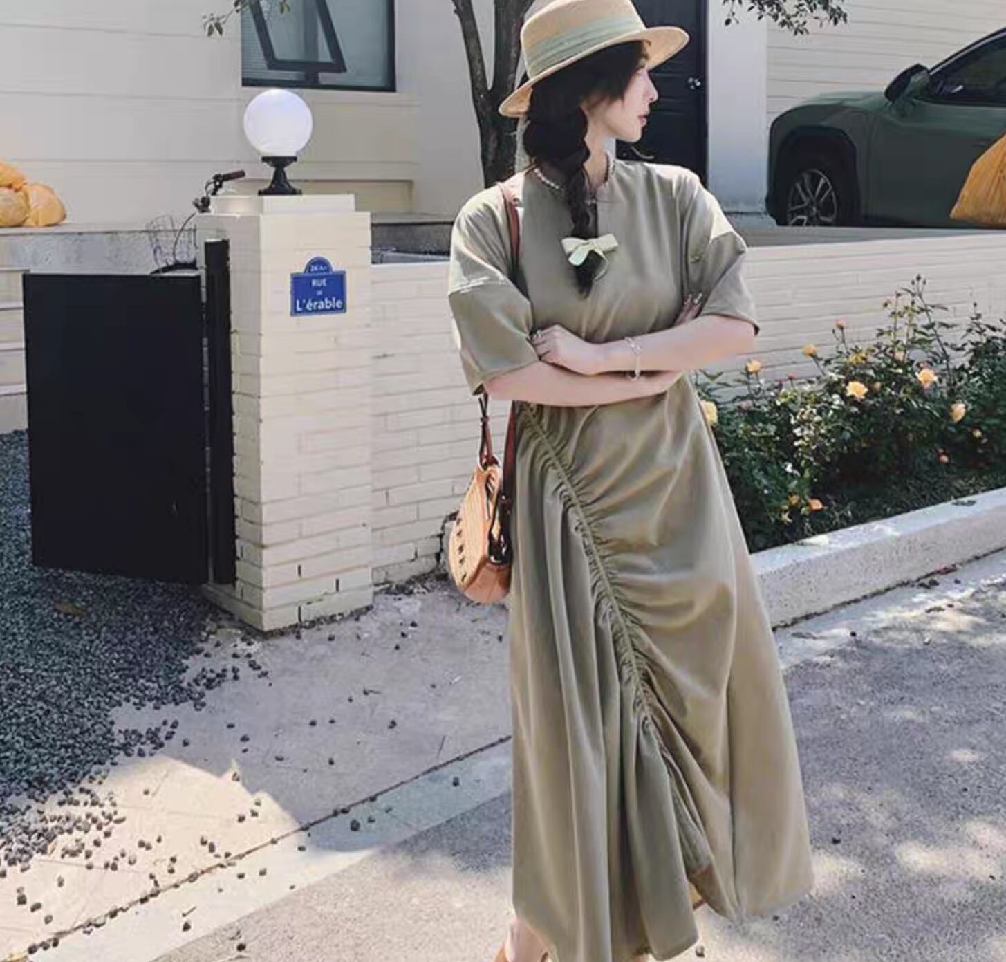 レディース ワンピース ミモレ 5分袖 スキッパー アシンメトリー フェミニン タック ギャザー 切り替えデザイン かわいい 大人可愛い カジュアル おしゃれ かっこいい こなれ感 ラフ ガーリー ルーズ 個性的 モード系 抜け感 ラブリー キュート ベーシック カントリー アクティブ ロマンティック ナチュラル 無地 春 夏 デート お出かけ 旅行 女子会 休日 バカンス ライブ フェス アースカラー 楽ちん 体型カバー 清楚 トレンド 流行 S M L XL 小さいサイズ 大きいサイズ 緑 グリーン