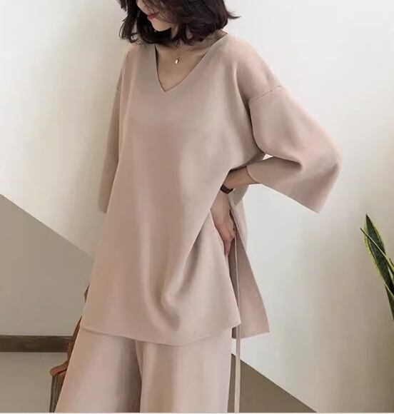 二点セット 上下セット ツーピース レディース トップス パンツ ニット セーター プルオーバー ワイドパンツ フルレングス 半袖 5分袖 Vネック バックリボン スリット ウエストゴム ストレッチ 伸縮性 大人可愛い きれいめ シンプル カジュアル 上品 おしゃれ レトロ こなれ感 ラフ ボーイッシュ ルーズ クール エレガント ナチュラル 無地 春 秋 デート お出かけ 体型カバー 普段使い 着回し トレンド 流行 ゆったり ゆる フリーサイズ 大きめ オーバーサイズ ブラック ブラウン アプリコット