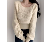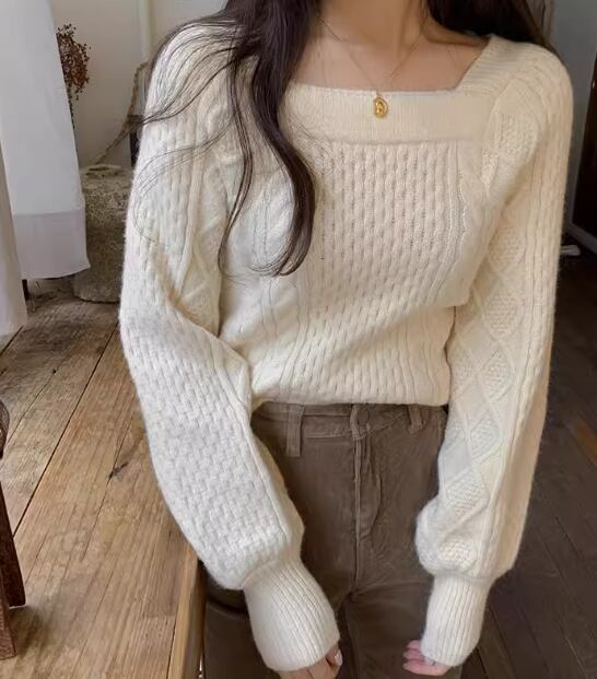 トップス ニット セーター プルオーバー ショート 長袖 ボリューム袖 ラグラン ランタンスリーブ スクエアネック ストレート 綿 ケーブルニット 大人可愛い きれいめ シンプル カジュアル 上品 おしゃれ レトロ エレガント ナチュラル シック 秋 冬 デート お出かけ 韓国 普段使い 着回し フリーサイズ ブラック オフホワイト カーキ 秋カラー