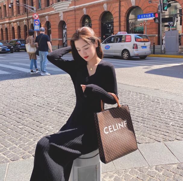 このニットワンピースは、膝下までのロング丈で、タイトなシルエットが大人可愛さを引き立てます。