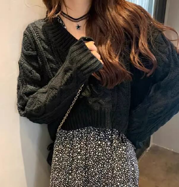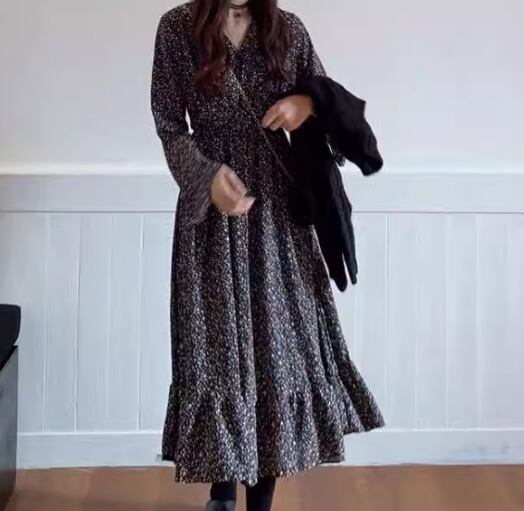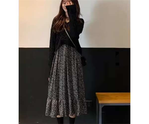 上品で優しげな小花柄が可愛い長袖のロングワンピースとシックなブラックのニットセーターの二点セット。