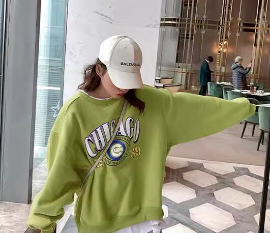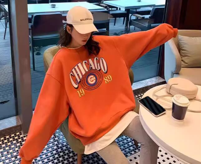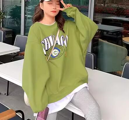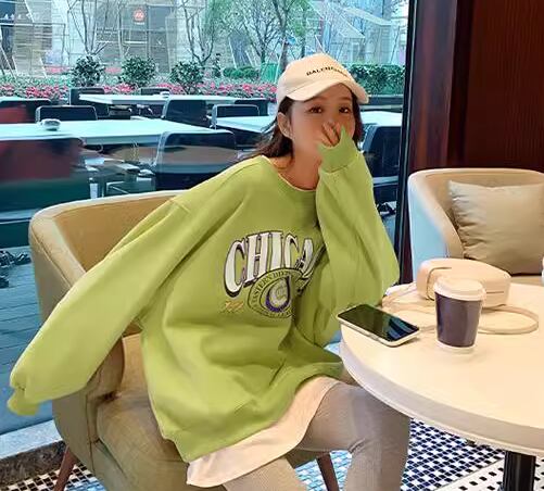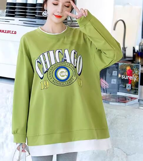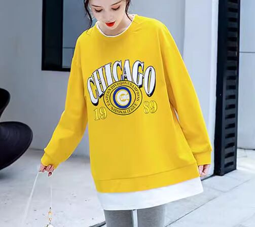 重ね着風 フェイクツーピース レディース トップス プルオーバー トレーナー スウェット ミドル丈 長袖 ラウンドネック 厚手 ベルベット かわいい カジュアル おしゃれ レトロ ラフ ボーイッシュ ルーズ クール 存在感 キュート 華やか スタイリッシュ プリント 秋 冬 デート お出かけ 韓国 普段使い 着回し トレンド 流行 M L XL ゆったり ゆる 大きめ オーバーサイズ イエロー ピンク オレンジ グリーン