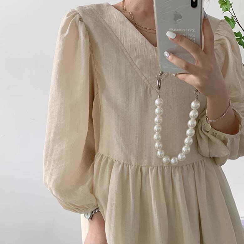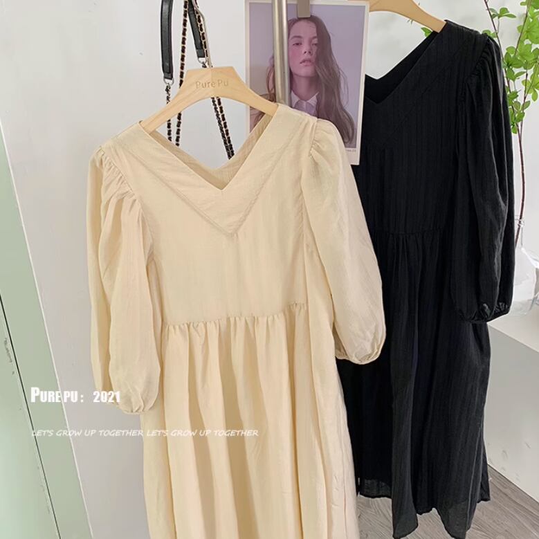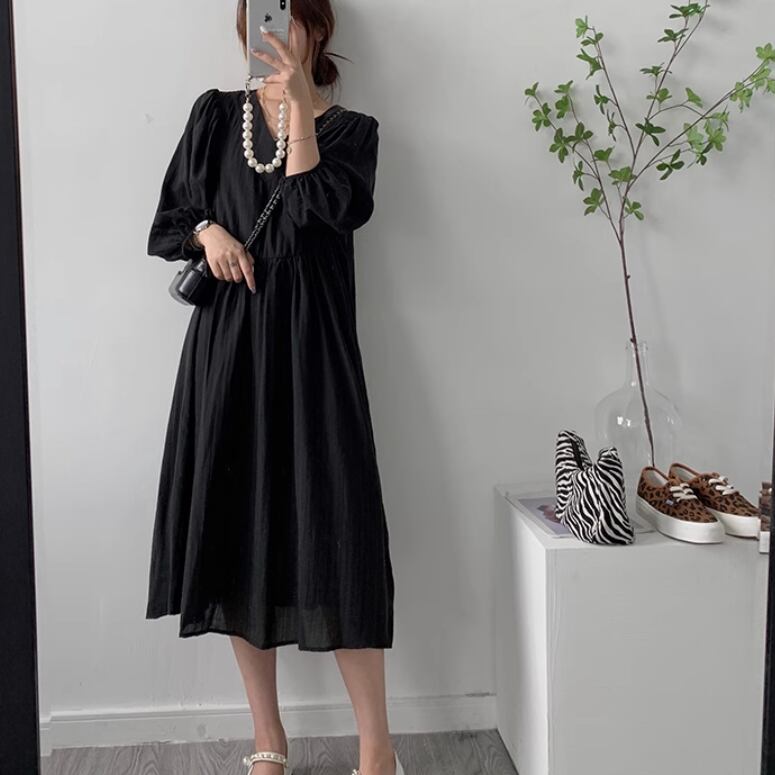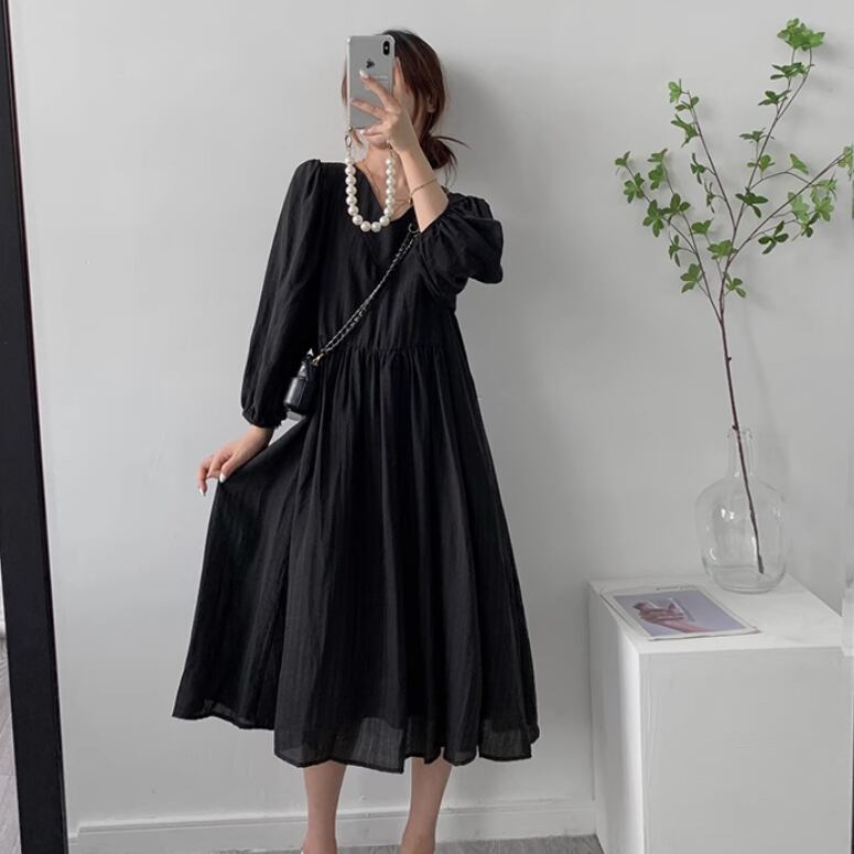 レディース ワンピース プルオーバー ドレス ロングスカート ミモレ 長袖 パフスリーブ Vネック 襟なし ノーカラー ワイド Aライン 伸縮性 薄手 かわいい 大人可愛い きれいめ シンプル カジュアル 上品 おしゃれ レトロ こなれ感 ラフ ルーズ 個性的 エレガント 主役級 存在感 とろみ感 抜け感 ラブリー キュート ベーシック ロマンティック ナチュラル 無地 春 夏 デート お出かけ 女子会 休日 カフェ コーデ 楽ちん 体型カバー 普段使い 清楚 ゆったり ゆる ブラック アプリコット